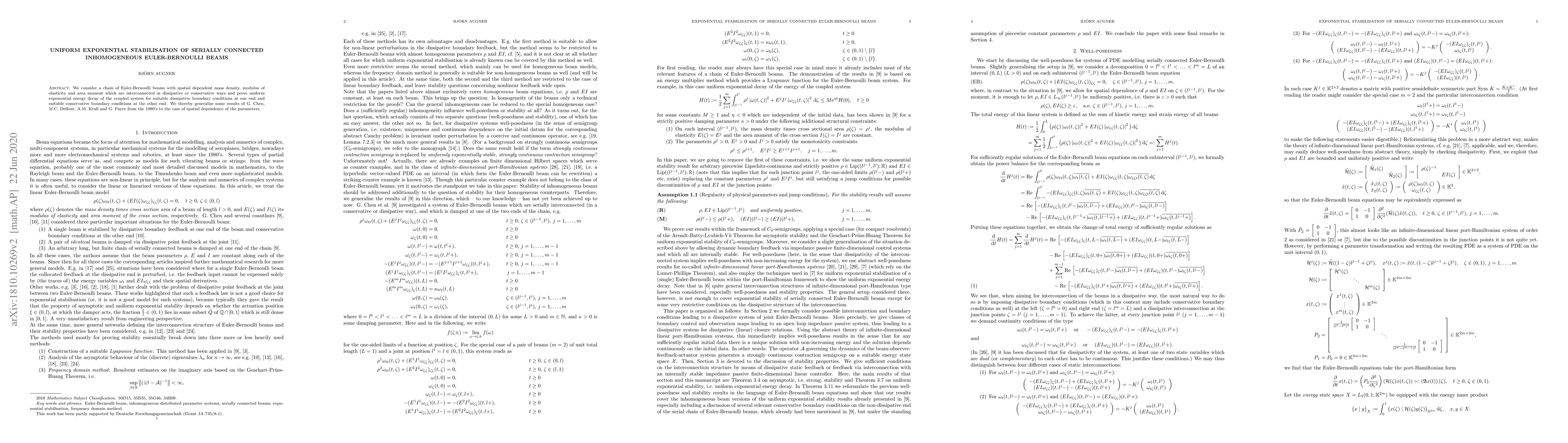This paper proves uniform exponential stabilisation for a series of inhomogeneous Euler-Bernoulli beams with spatially varying mass, elasticity, and area moment, under dissipative and conservative interconnections. It extends earlier results to account for spatially dependent parameters.