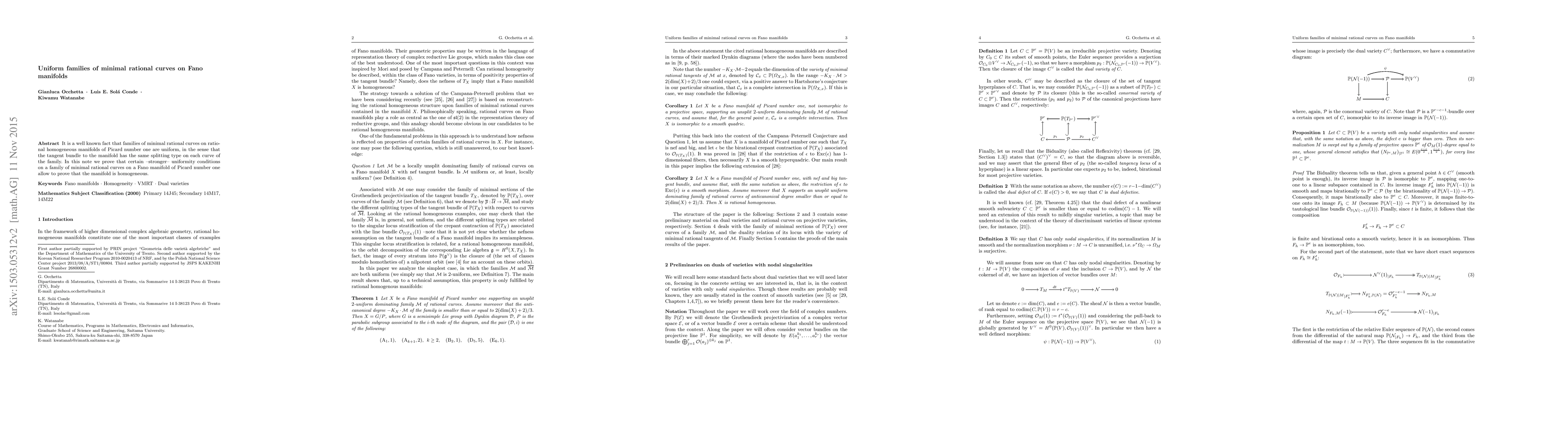 This paper demonstrates that uniform families of minimal rational curves on Fano manifolds with Picard number one imply the homogeneity of the manifold, highlighting stronger uniformity conditions beyond simple tangent bundle splitting type consistency.