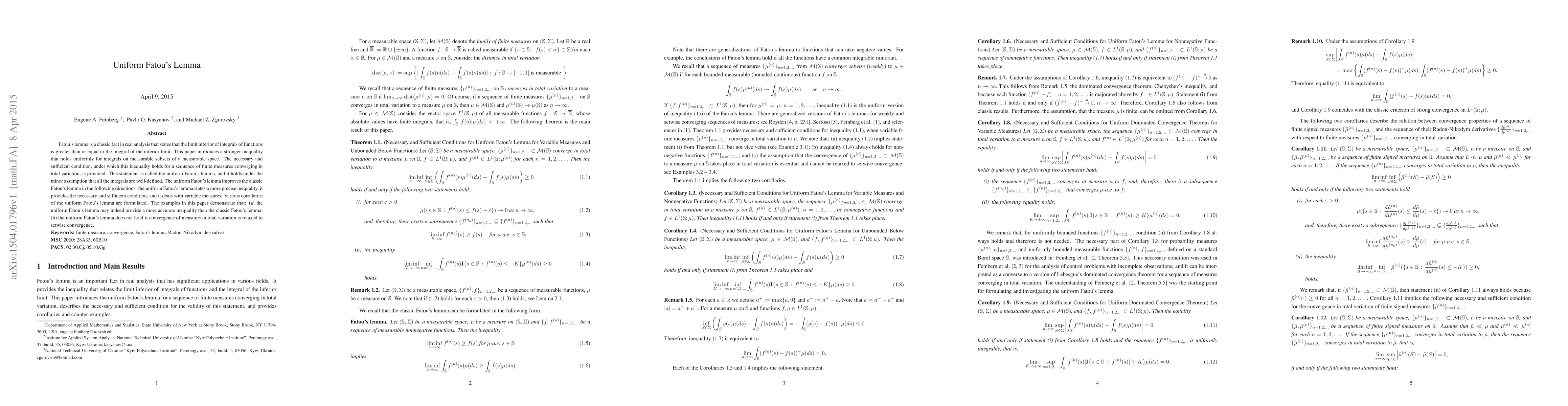 The paper introduces the uniform Fatou's lemma, a stronger version of the classic Fatou's lemma that holds uniformly for integrals on measurable subsets, providing a more precise inequality and necessary conditions for convergence in total variation. The uniform Fatou's lemma demonstrates improved accuracy over the classic lemma and highlights the importance of total variation convergence.