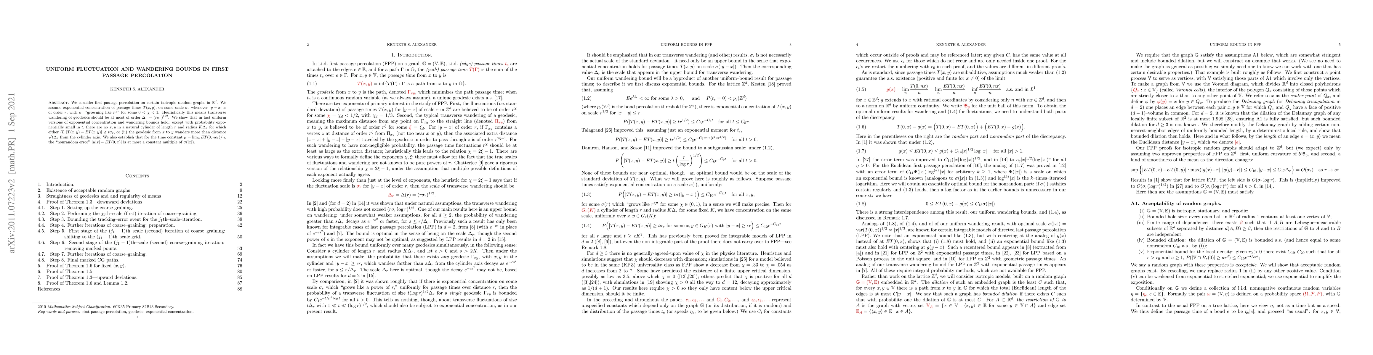 We consider first passage percolation on certain isotropic random graphs in $\mathbb{R}^d$. We assume exponential concentration of passage times $T(x,y)$, on some scale $\sigma_r$ whenever $|y-x|$ is of order $r$, with $\sigma_r$ "growning like $r^\chi$" for some $0<\chi<1$. Heuristically this means transverse wandering of geodesics should be at most of order $\Delta_r = (r\sigma_r)^{1/2}$. We show that in fact uniform versions of exponential concentration and wandering bounds hold: except with probability exponentially small in $t$, there are no $x,y$ in a natural cylinder of length $r$ and radius $K\Delta_r$ for which either (i) $|T(x,y) - ET(x,y)|\geq t\sigma_r$, or (ii) the geodesic from $x$ to $y$ wanders more than distance $\sqrt{t}\Delta_r$ from the cylinder axis. We also establish that for the time constant $\mu = \lim_n ET(0,ne_1)/n$, the "nonrandom error" $|\mu|x| - ET(0,x)|$ is at most a constant multiple of $\sigma(|x|)$.