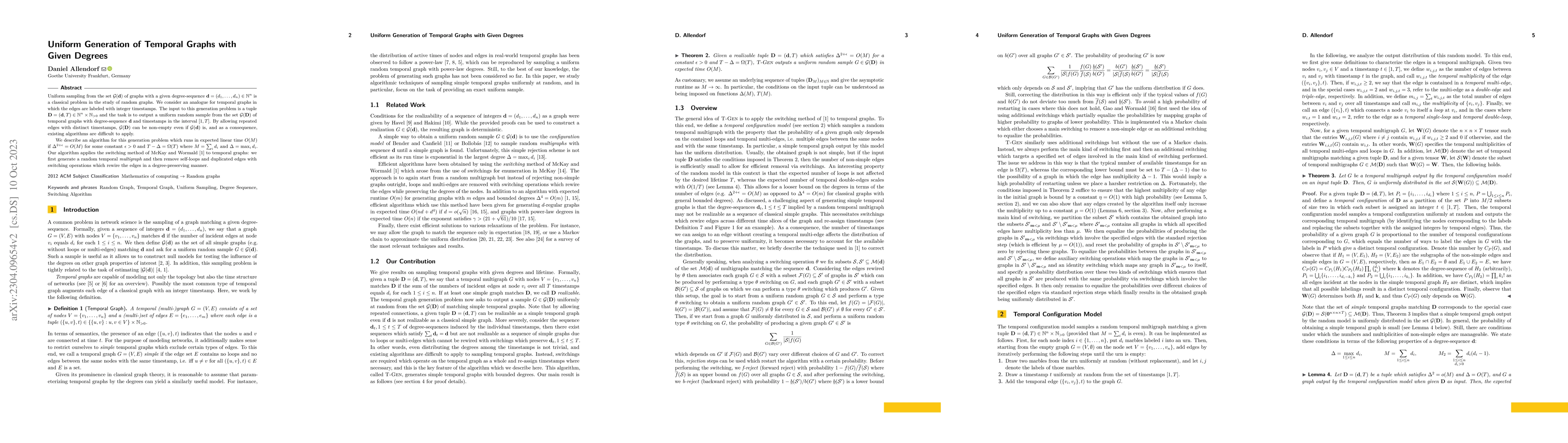 This paper presents an algorithm for uniformly generating temporal graphs with a specified degree sequence and a given timestamp range. The algorithm employs the switching method to generate a random temporal multigraph and then refines it by removing self-loops and duplicated edges, ensuring the output is uniformly random and degree-preserving.