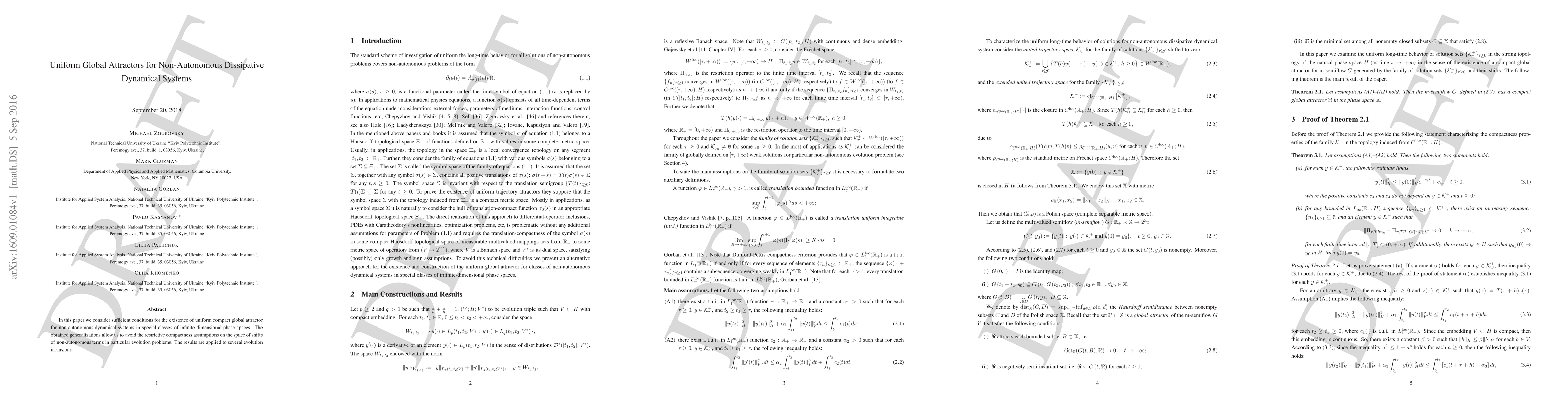 This paper establishes sufficient conditions for the existence of uniform global attractors in non-autonomous dissipative dynamical systems within infinite-dimensional phase spaces, generalizing results to avoid strict compactness assumptions. The findings are applied to several evolution inclusions.
