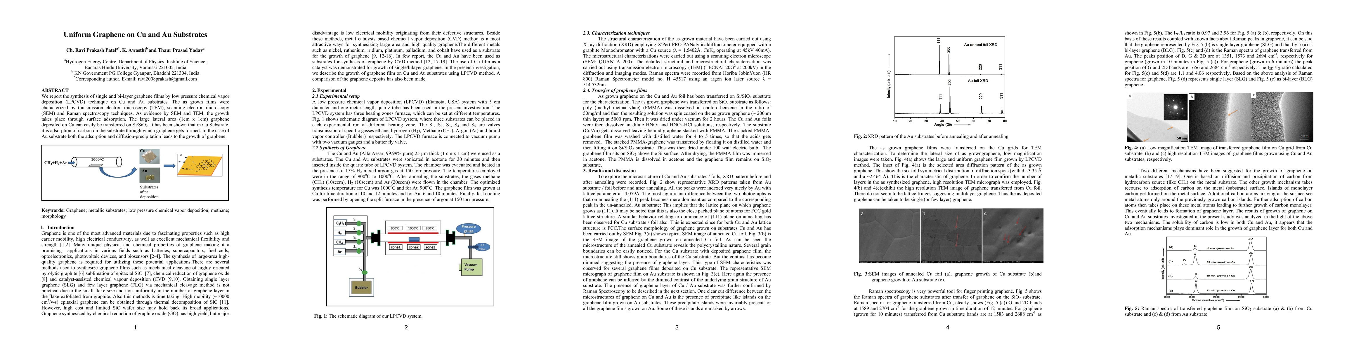 This study synthesizes single and bilayer graphene on Cu and Au substrates using low pressure chemical vapor deposition, with characterization via microscopy and Raman spectroscopy. Cu-grown graphene is easily transferable to Si SiO2, while Au substrate promotes adsorption and diffusion-precipitation growth mechanisms.