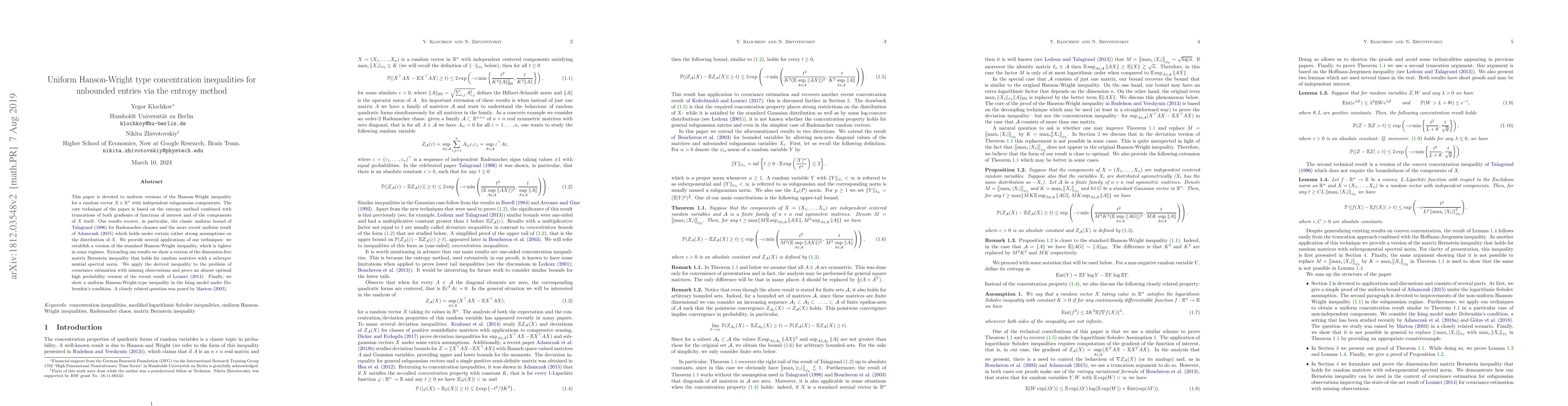 This paper develops uniform Hanson-Wright inequalities for random vectors with independent subgaussian components using the entropy method and truncations. It extends classic uniform bounds and applies to covariance estimation with missing data and the Ising model.