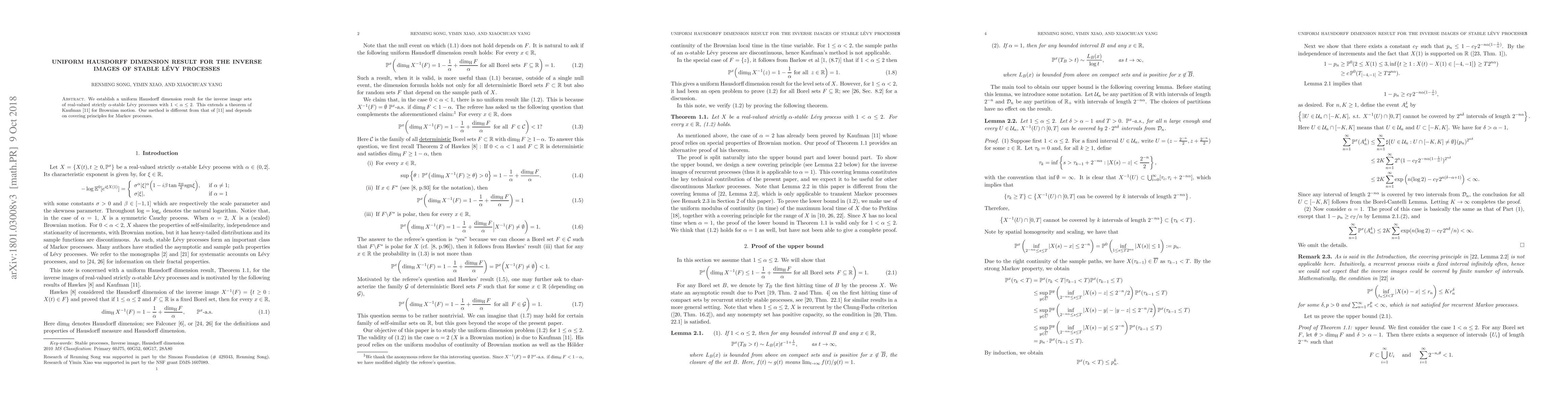 The paper establishes a uniform Hausdorff dimension result for the inverse images of real-valued strictly α-stable Lévy processes with 1 < α ≥ 2, extending a theorem on Brownian motion.