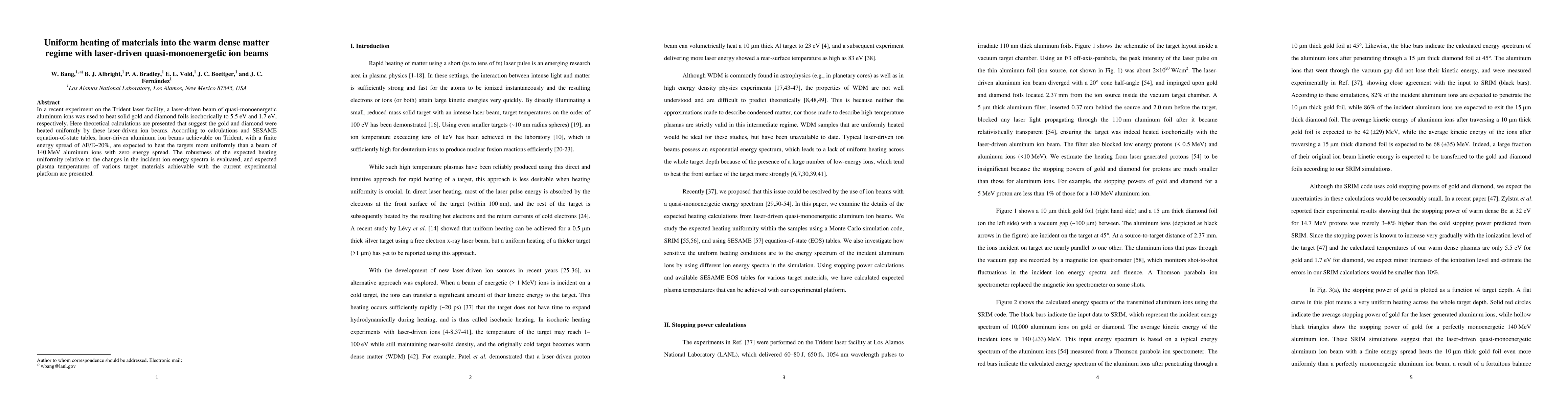 This research demonstrates that laser-driven quasi-monoenergetic ion beams can uniformly heat solid gold and diamond to high temperatures, achieving 5.5 eV and 1.7 eV respectively, using theoretical calculations that support uniform heating. The study finds that these beams, with a finite energy spread, provide more uniform heating compared to monoenergetic beams.