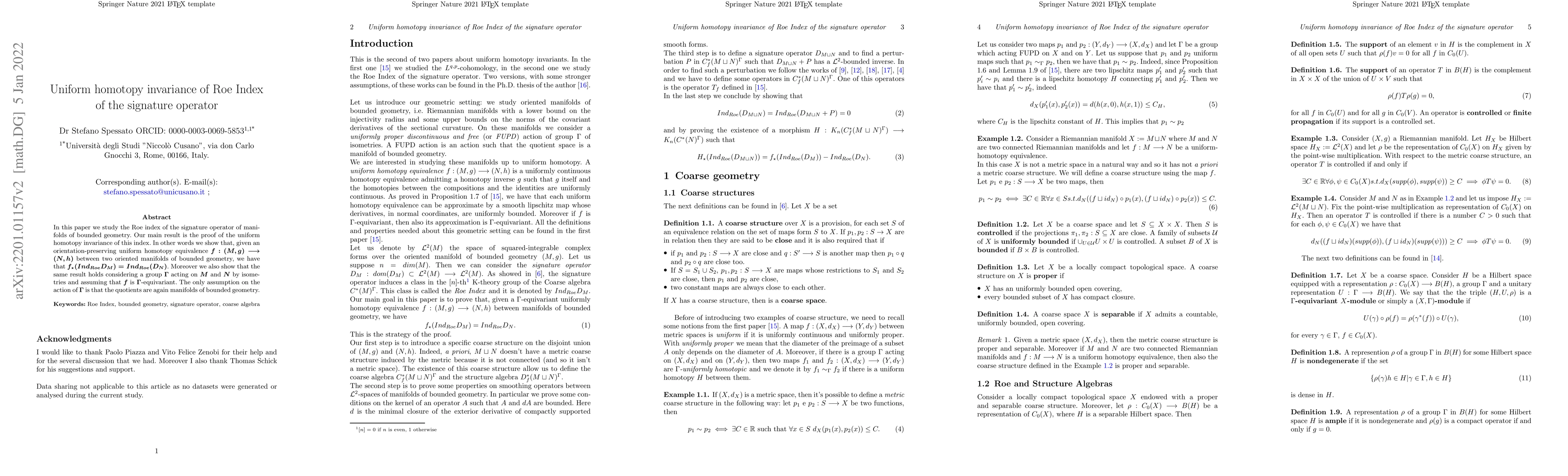 This paper proves that the Roe index of the signature operator remains unchanged under orientation-preserving uniform homotopy equivalences between manifolds of bounded geometry.