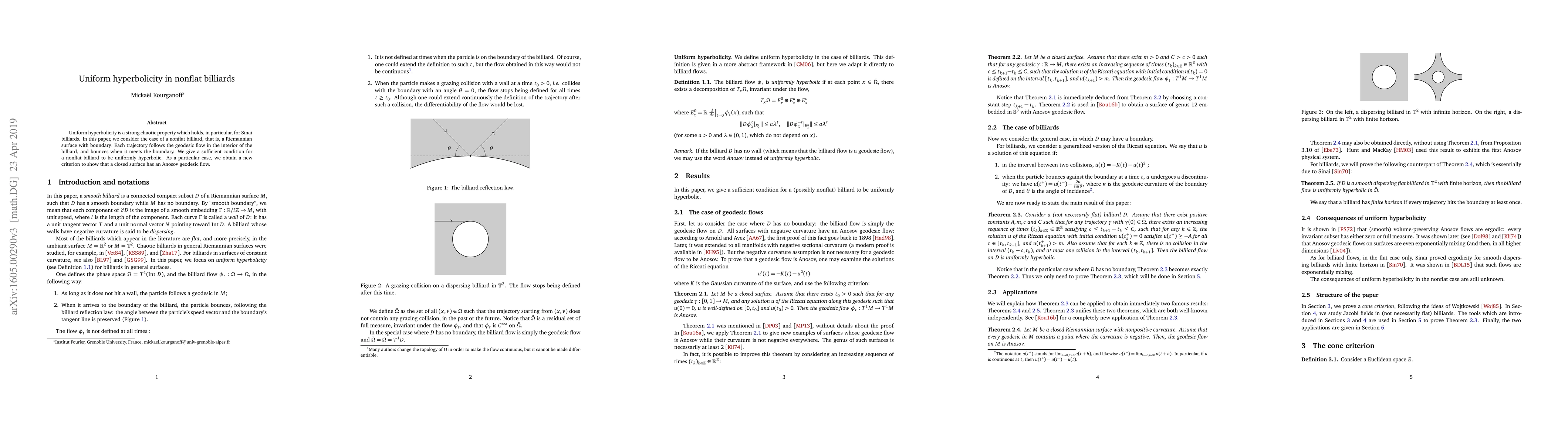 Researchers found a condition that determines if a nonflat billiard is uniformly hyperbolic, a strong chaotic property, and showed it's related to closed surfaces having an Anosov geodesic flow.