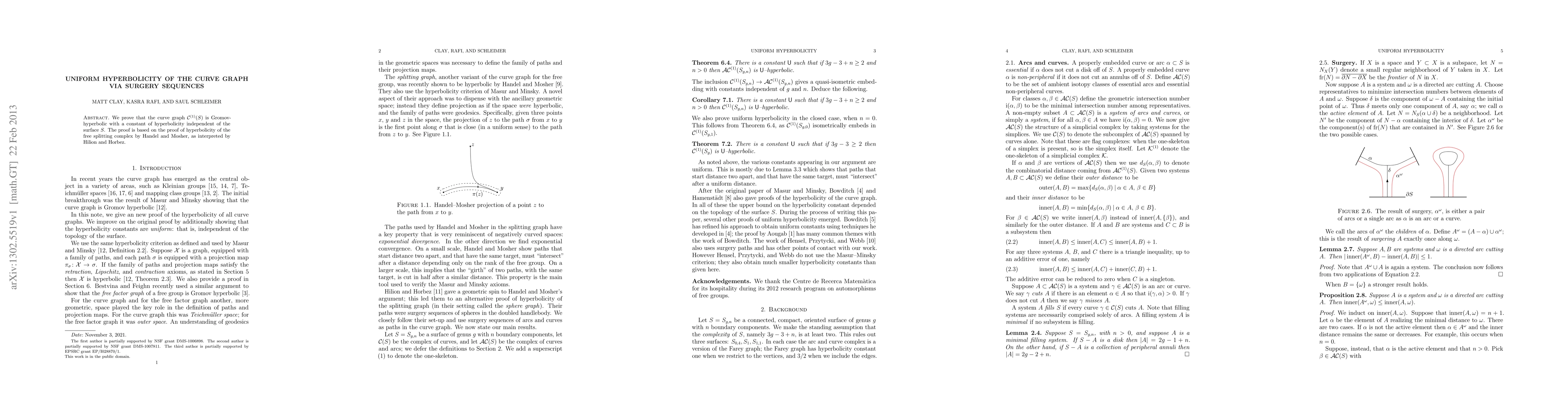 Summary: The paper demonstrates that the curve graph $\calC^{(1)}(S)$ is uniformly Gromov-hyperbolic, regardless of the surface $S$, using techniques from the hyperbolicity proof of the free splitting complex by Handel, Mosher, Hilion, and Horbez. The hyperbolicity constant remains independent of the surface.