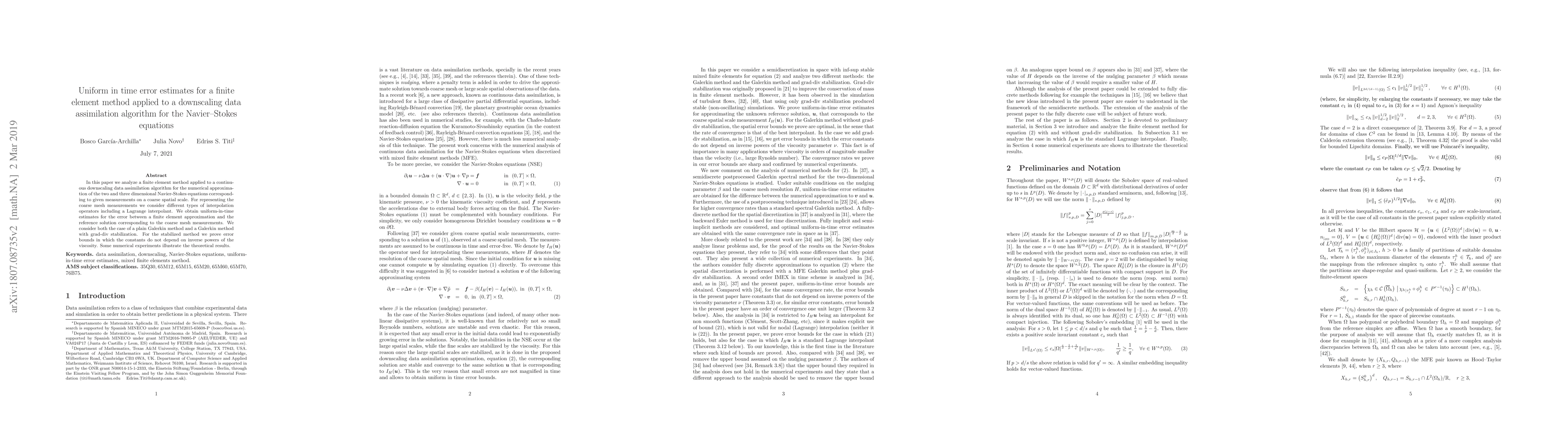 This paper analyzes a finite element method for a downscaling data assimilation algorithm applied to the Navier-Stokes equations, obtaining uniform-in-time error estimates. It compares plain and stabilized Galerkin methods, proving that the latter's error bounds are independent of viscosity, and supports findings with numerical experiments.