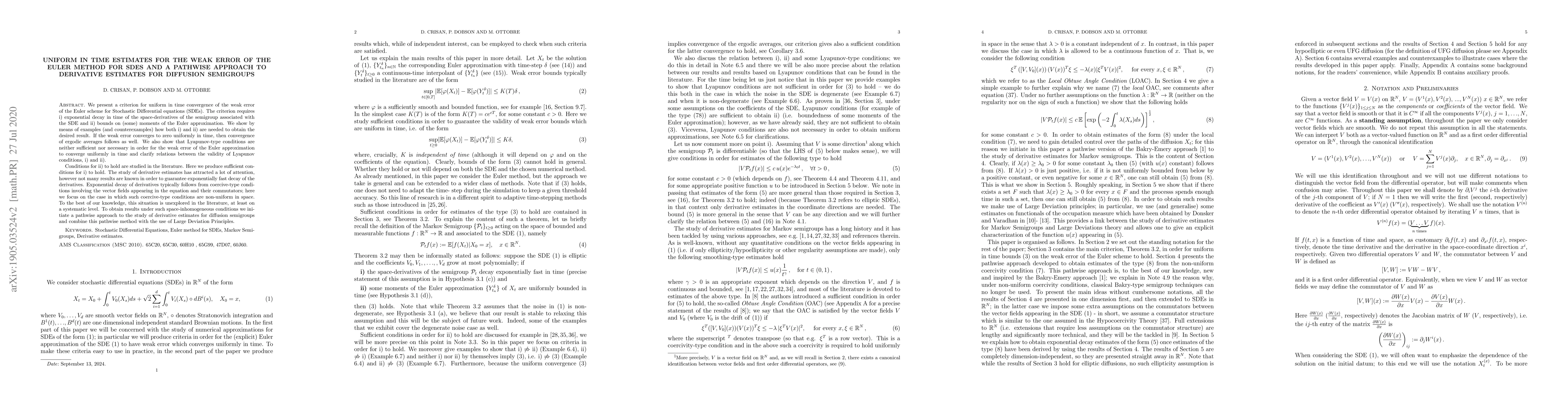 We present a criterion for uniform in time convergence of the weak error of the Euler scheme for Stochastic Differential equations (SDEs). The criterion requires i) exponential decay in time of the space-derivatives of the semigroup associated with the SDE and ii) bounds on (some) moments of the Euler approximation. We show by means of examples (and counterexamples) how both i) and ii) are needed to obtain the desired result. If the weak error converges to zero uniformly in time, then convergence of ergodic averages follows as well. We also show that Lyapunov-type conditions are neither sufficient nor necessary in order for the weak error of the Euler approximation to converge uniformly in time and clarify relations between the validity of Lyapunov conditions, i) and ii). Conditions for ii) to hold are studied in the literature. Here we produce sufficient conditions for i) to hold. The study of derivative estimates has attracted a lot of attention, however not many results are known in order to guarantee exponentially fast decay of the derivatives. Exponential decay of derivatives typically follows from coercive-type conditions involving the vector fields appearing in the equation and their commutators; here we focus on the case in which such coercive-type conditions are non-uniform in space. To the best of our knowledge, this situation is unexplored in the literature, at least on a systematic level. To obtain results under such space-inhomogeneous conditions we initiate a pathwise approach to the study of derivative estimates for diffusion semigroups and combine this pathwise method with the use of Large Deviation Principles.