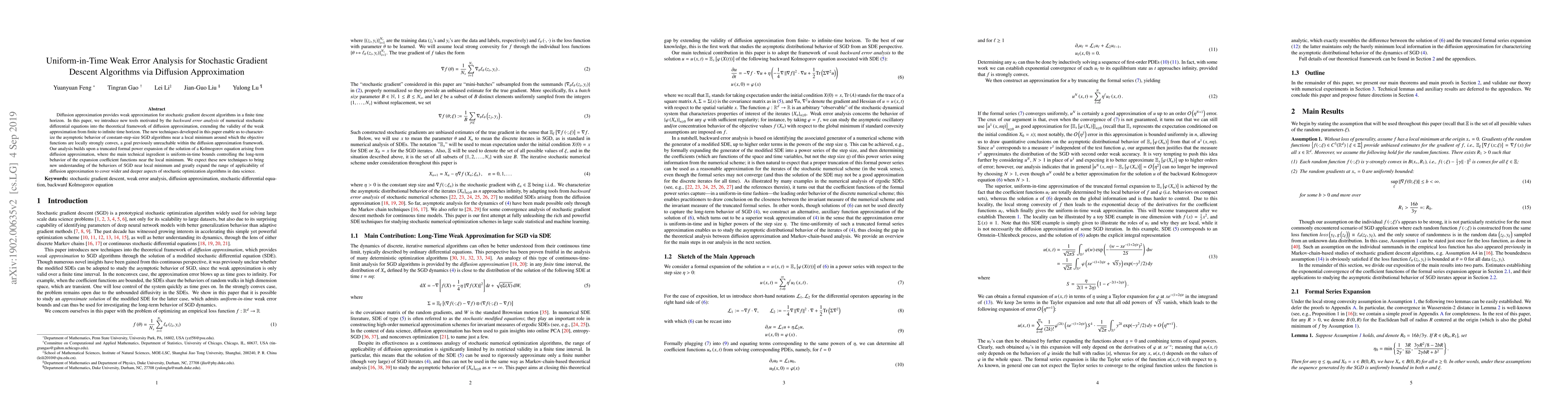 Diffusion approximation provides weak approximation for stochastic gradient descent algorithms in a finite time horizon. In this paper, we introduce new tools motivated by the backward error analysis of numerical stochastic differential equations into the theoretical framework of diffusion approximation, extending the validity of the weak approximation from finite to infinite time horizon. The new techniques developed in this paper enable us to characterize the asymptotic behavior of constant-step-size SGD algorithms for strongly convex objective functions, a goal previously unreachable within the diffusion approximation framework. Our analysis builds upon a truncated formal power expansion of the solution of a stochastic modified equation arising from diffusion approximation, where the main technical ingredient is a uniform-in-time weak error bound controlling the long-term behavior of the expansion coefficient functions near the global minimum. We expect these new techniques to greatly expand the range of applicability of diffusion approximation to cover wider and deeper aspects of stochastic optimization algorithms in data science.