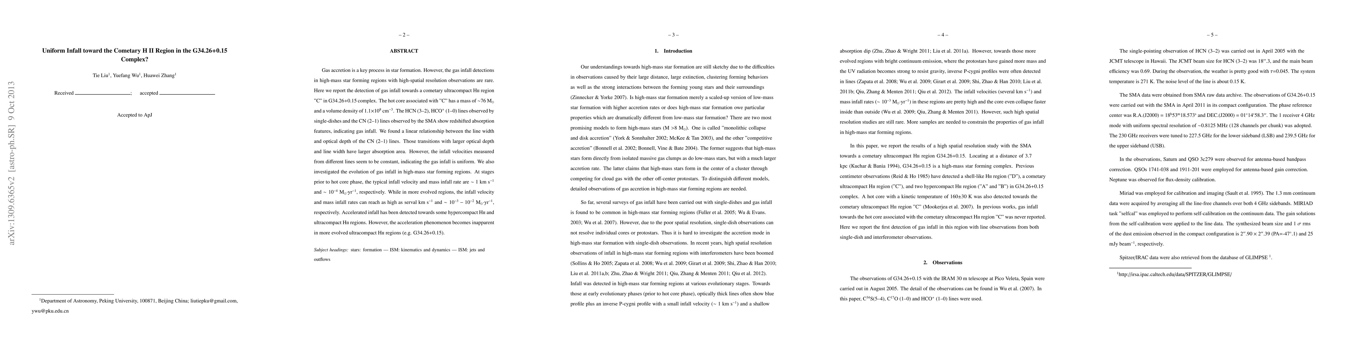 Researchers detected uniform gas infall towards a cometary ultracompact H II region in the G34.26+0.15 complex, revealing a consistent infall velocity of around 1 km s$^{-1}$.
