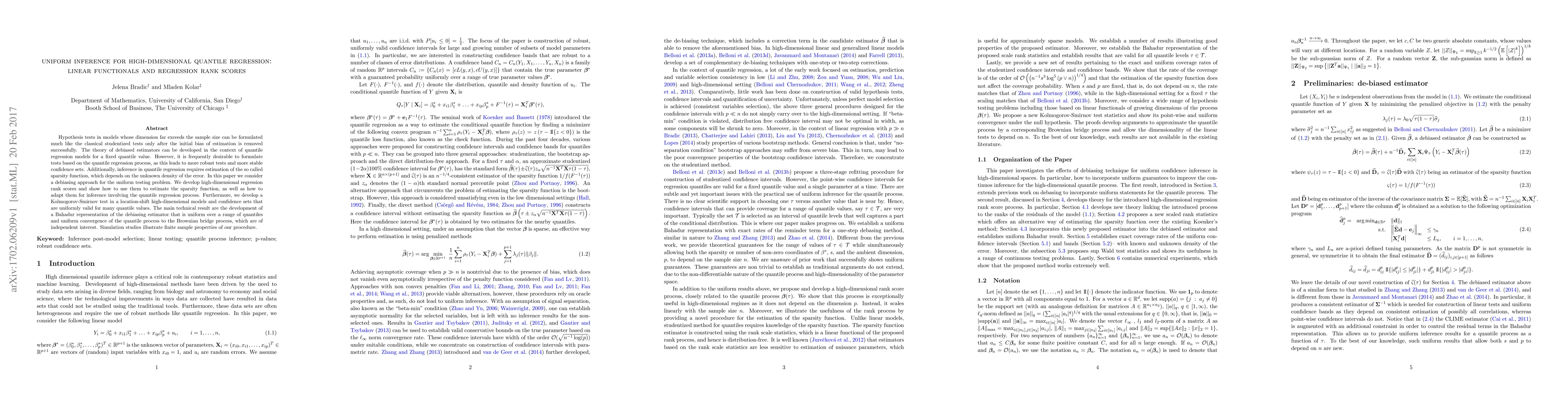 This paper develops a debiasing approach for high-dimensional quantile regression, introducing high-dimensional regression rank scores to estimate the sparsity function and adapt for robust inference. It also presents a Kolmogorov-Smirnov test and uniformly valid confidence sets for multiple quantile values, supported by simulation studies.