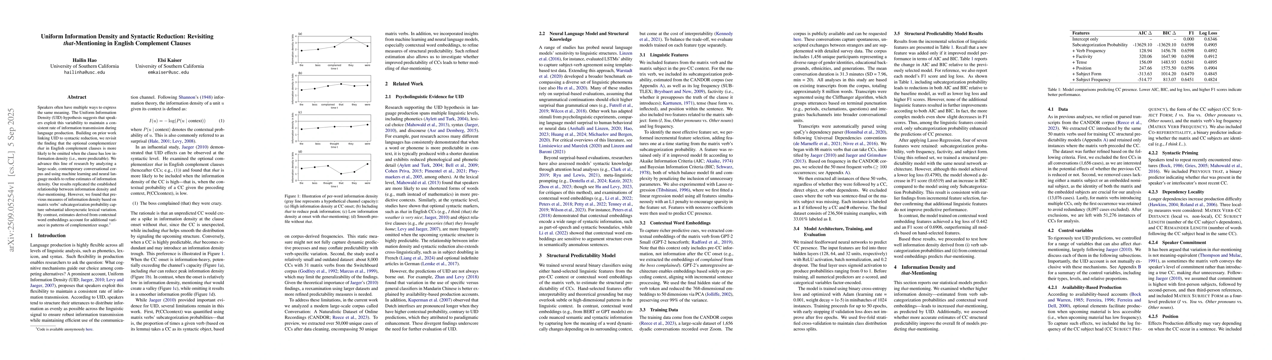 Speakers often have multiple ways to express the same meaning. The Uniform Information Density (UID) hypothesis suggests that speakers exploit this variability to maintain a consistent rate of information transmission during language production. Building on prior work linking UID to syntactic reduction, we revisit the finding that the optional complementizer $\textit{that}$in English complement clauses is more likely to be omitted when the clause has low information density (i.e., more predictable). We advance this line of research by analyzing a large-scale, contemporary conversational corpus and using machine learning and neural language models to refine estimates of information density. Our results replicated the established relationship between information density and $\textit{that}$-mentioning. However, we found that previous measures of information density based on matrix verbs' subcategorization probability capture substantial idiosyncratic lexical variation. By contrast, estimates derived from contextual word embeddings account for additional variance in patterns of complementizer usage.