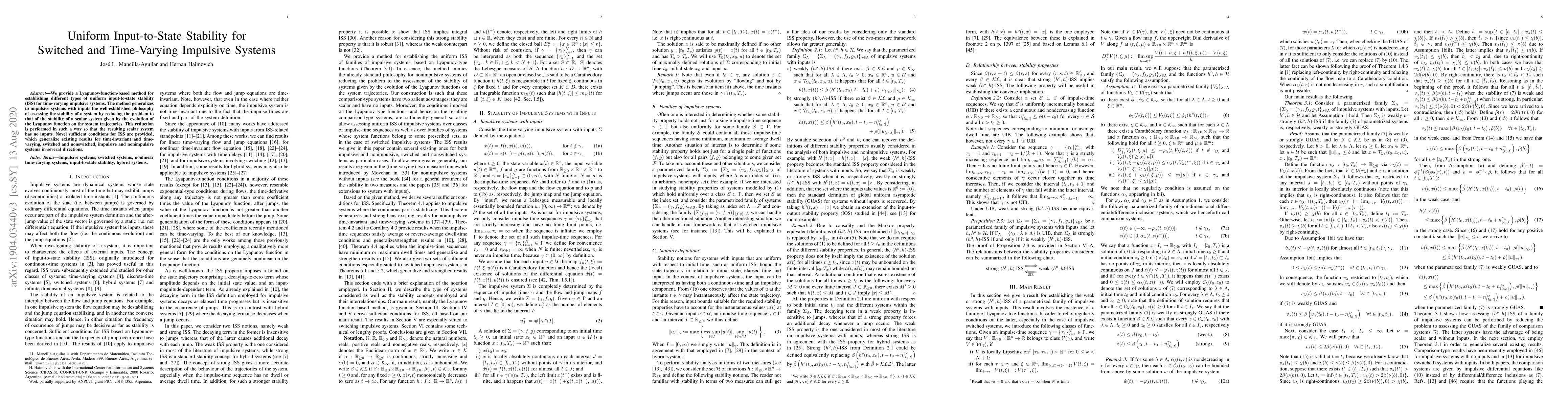 We provide a Lyapunov-function-based method for establishing different types of uniform input-to-state stability (ISS) for time-varying impulsive systems. The method generalizes to impulsive systems with inputs the well-established philosophy of assessing the stability of a system by reducing the problem to that of the stability of a scalar system given by the evolution of the Lyapunov function on the system trajectories. This reduction is performed in such a way so that the resulting scalar system has no inputs. Novel sufficient conditions for ISS are provided, which generalize existing results for time-invariant and time-varying, switched and nonswitched, impulsive and nonimpulsive systems in several directions.