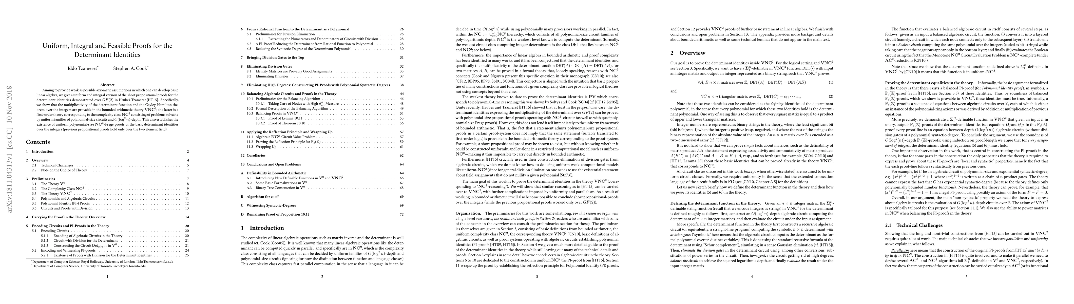 This paper presents uniform and integral proofs for determinant identities using minimal axiomatic assumptions, showing multiplicativity and the Cayley-Hamilton theorem are provable in $\mathbf{VNC}^2$, establishing uniform $\mathbf{NC}^2$-Frege proofs for these identities over the integers.