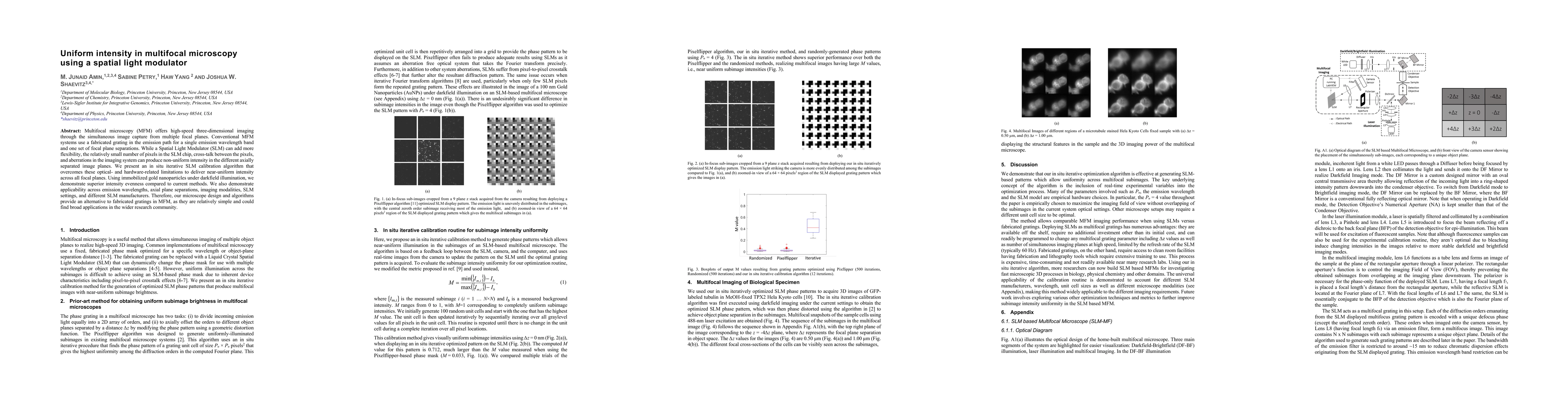 Multifocal microscopy (MFM) offers high-speed three-dimensional imaging through the simultaneous image capture from multiple focal planes. Conventional MFM systems use a fabricated grating in the emission path for a single emission wavelength band and one set of focal plane separations. While a Spatial Light Modulator (SLM) can add more flexibility, the relatively small number of pixels in the SLM chip, cross-talk between the pixels, and aberrations in the imaging system can produce non-uniform intensity in the different axially separated image planes. We present an in situ iterative SLM calibration algorithm that overcomes these optical- and hardware-related limitations to deliver near-uniform intensity across all focal planes. Using immobilized gold nanoparticles under darkfield illumination, we demonstrate superior intensity evenness compared to current methods. We also demonstrate applicability across emission wavelengths, axial plane separations, imaging modalities, SLM settings, and different SLM manufacturers. Therefore, our microscope design and algorithms provide an alternative to fabricated gratings in MFM, as they are relatively simple and could find broad applications in the wider research community.
