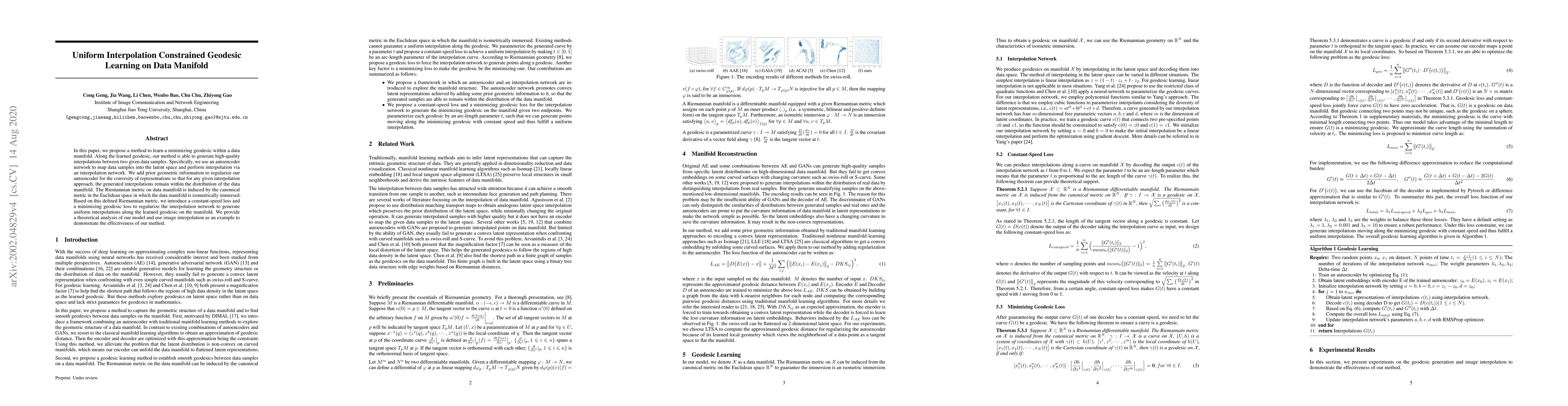 In this paper, we propose a method to learn a minimizing geodesic within a data manifold. Along the learned geodesic, our method can generate high-quality interpolations between two given data samples. Specifically, we use an autoencoder network to map data samples into latent space and perform interpolation via an interpolation network. We add prior geometric information to regularize our autoencoder for the convexity of representations so that for any given interpolation approach, the generated interpolations remain within the distribution of the data manifold. Before the learning of a geodesic, a proper Riemannianmetric should be defined. Therefore, we induce a Riemannian metric by the canonical metric in the Euclidean space which the data manifold is isometrically immersed in. Based on this defined Riemannian metric, we introduce a constant speed loss and a minimizing geodesic loss to regularize the interpolation network to generate uniform interpolation along the learned geodesic on the manifold. We provide a theoretical analysis of our model and use image translation as an example to demonstrate the effectiveness of our method.