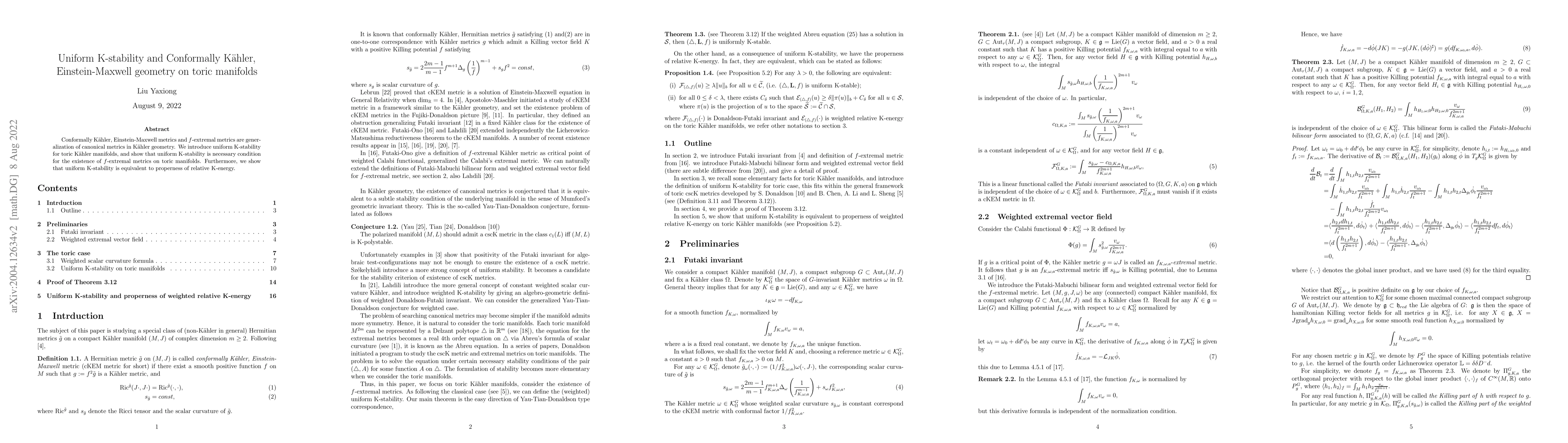 Conformally K\"{a}hler, Einstein-Maxwell metrics and $f$-extremal metrics are generalization of canonical metrics in K\"{a}hler geometry. We introduce uniform K-stability for toric K\"{a}hler manifolds, and show that uniform K-stability is necessary condition for the existence of $f$-extremal metrics on toric manifolds. Furthermore, we show that uniform K-stability is equivalent to properness of relative K-energy.