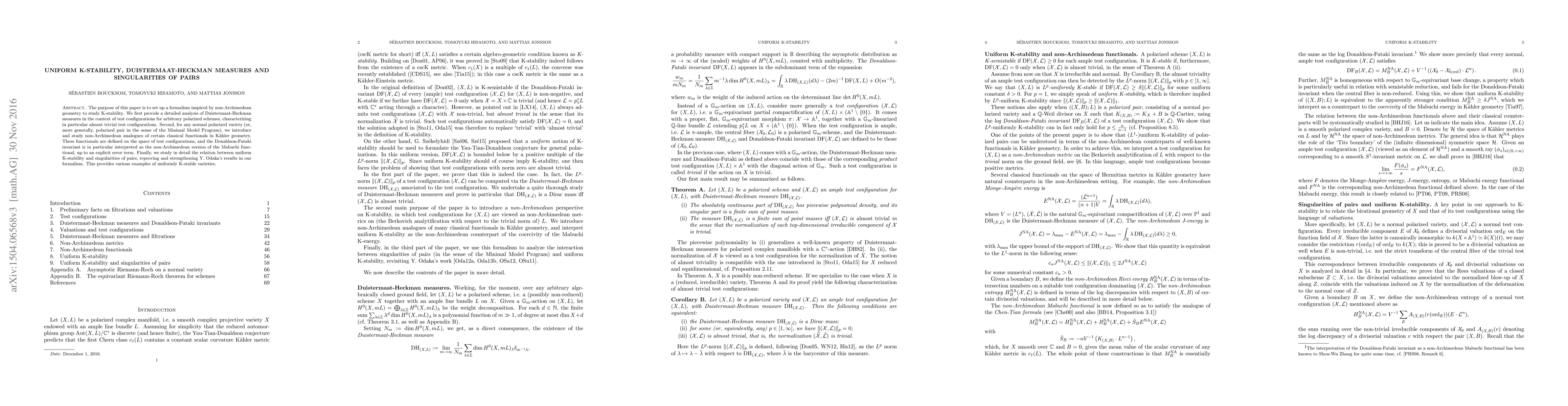 This paper develops a formalism inspired by non-Archimedean geometry to study K-stability, analyzing Duistermaat-Heckman measures and introducing non-Archimedean analogues of Kähler geometry functionals. It also explores the connection between uniform K-stability and singularities of pairs, providing new examples of uniformly K-stable varieties.