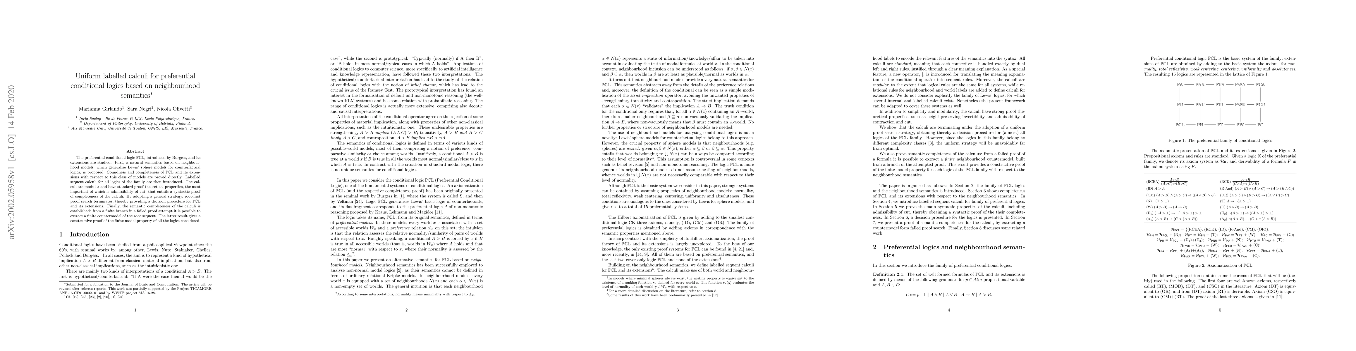 The preferential conditional logic PCL, introduced by Burgess, and its extensions are studied. First, a natural semantics based on neighbourhood models, which generalise Lewis' sphere models for counterfactual logics, is proposed. Soundness and completeness of PCL and its extensions with respect to this class of models are proved directly. Labelled sequent calculi for all logics of the family are then introduced. The calculi are modular and have standard proof-theoretical properties, the most important of which is admissibility of cut, that entails a syntactic proof of completeness of the calculi. By adopting a general strategy, root-first proof search terminates, thereby providing a decision procedure for PCL and its extensions. Finally, the semantic completeness of the calculi is established: from a finite branch in a failed proof attempt it is possible to extract a finite countermodel of the root sequent. The latter result gives a constructive proof of the finite model property of all the logics considered.