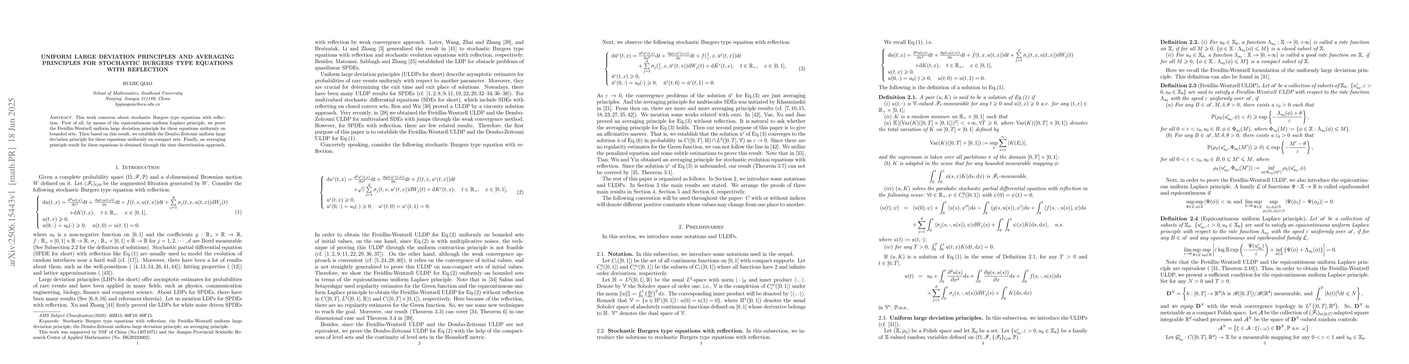 This work concerns about stochastic Burgers type equations with reflection. First of all, by means of the equicontinuous uniform Laplace principle, we prove the Freidlin-Wentzell uniform large deviation principle for these equations uniformly on bounded sets. Then based on this result, we establish the Dembo-Zeitouni uniform large deviation principle for these equations uniformly on compact sets. Finally, an averaging principle result for these equations is obtained through the time discretization approach.