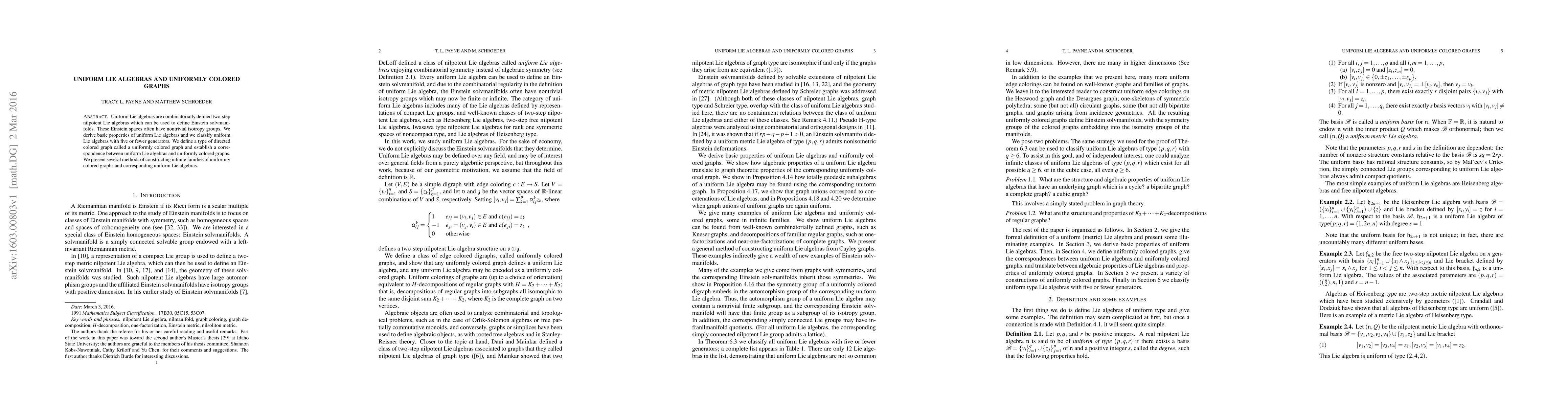 This paper studies uniform Lie algebras, a class of combinatorially defined two-step nilpotent Lie algebras linked to Einstein solvmanifolds. It classifies these algebras for five or fewer generators and introduces uniformly colored graphs, establishing a correspondence between them and uniform Lie algebras.