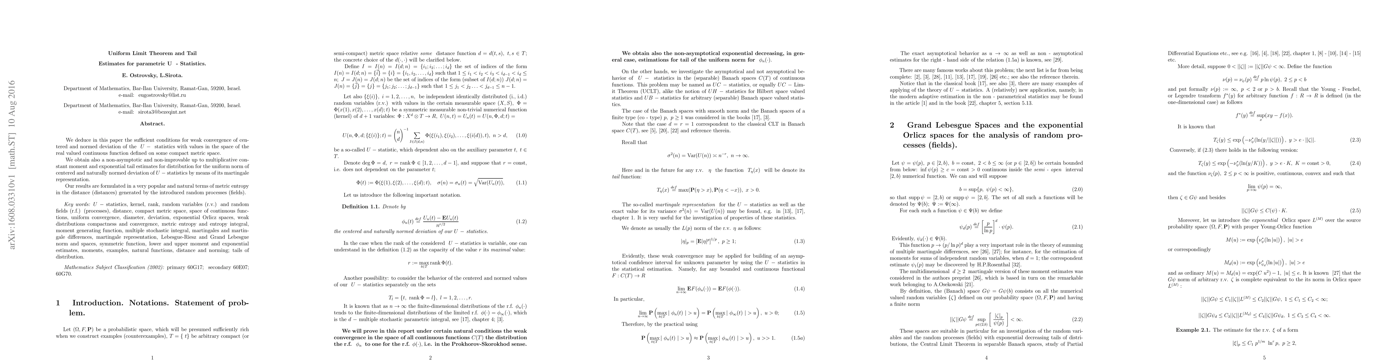 We deduce in this paper the sufficient conditions for weak convergence of centered and normed deviation of the u-statistics with values in the space of the real valued continuous function defined on some compact metric space. We obtain also a non-asymptotic and non-improvable up to multiplicative constant moment and exponential tail estimates for distribution for the uniform norm of centered and naturally normed deviation of u-statistics by means of its martingale representation. Our results are formulated in a very popular and natural terms of metric entropy in the distance (distances) generated by the introduced random processes (fields).