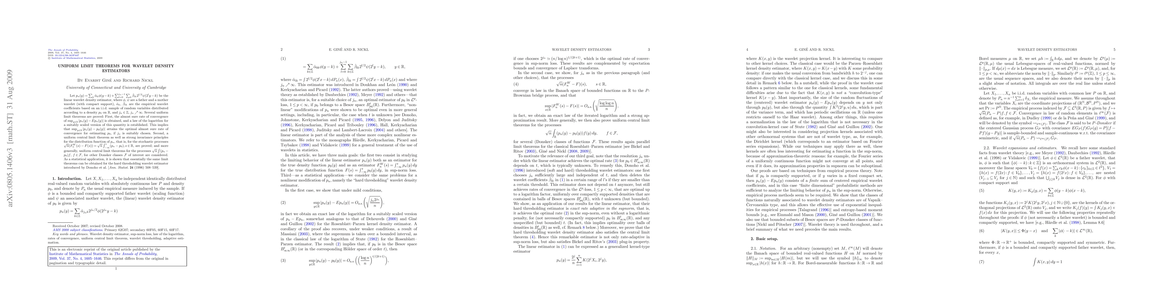 This paper proves uniform limit theorems for wavelet density estimators, establishing almost sure rate of convergence and a law of the logarithm for the estimator. It also proves uniform central limit theorems for the distribution function of the estimator and extends these results to Donsker classes, demonstrating applicability to hard thresholding wavelet estimators.