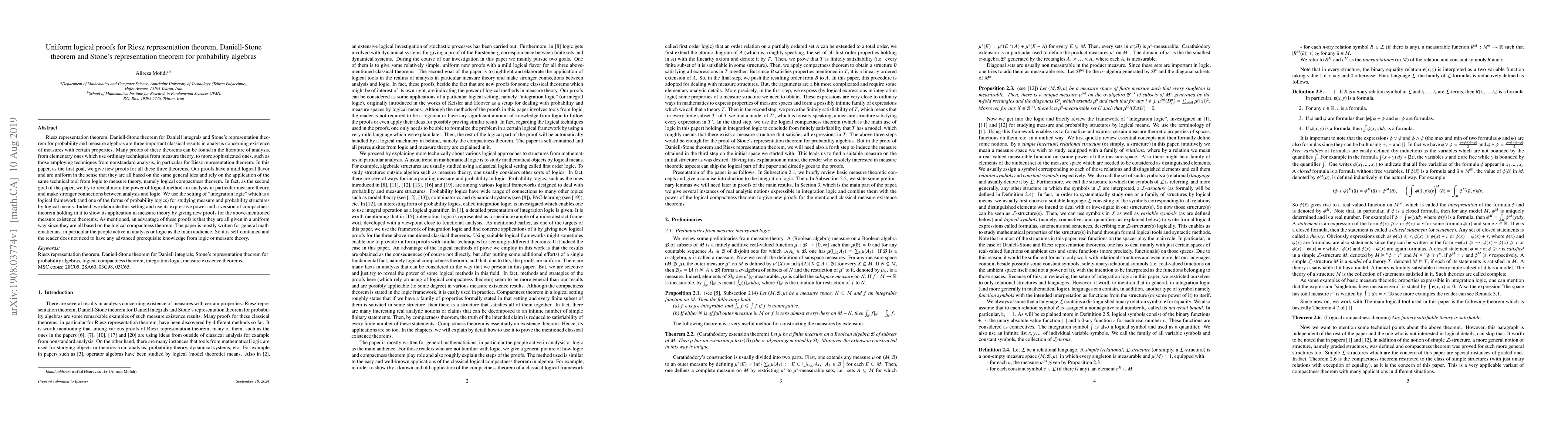 This paper presents new uniform logical proofs for the Riesz representation theorem, Daniell-Stone theorem, and Stone's representation theorem for probability algebras, all based on the logical compactness theorem. The author aims to demonstrate the power of logical methods in analysis, particularly measure theory, using the "integration logic" framework.