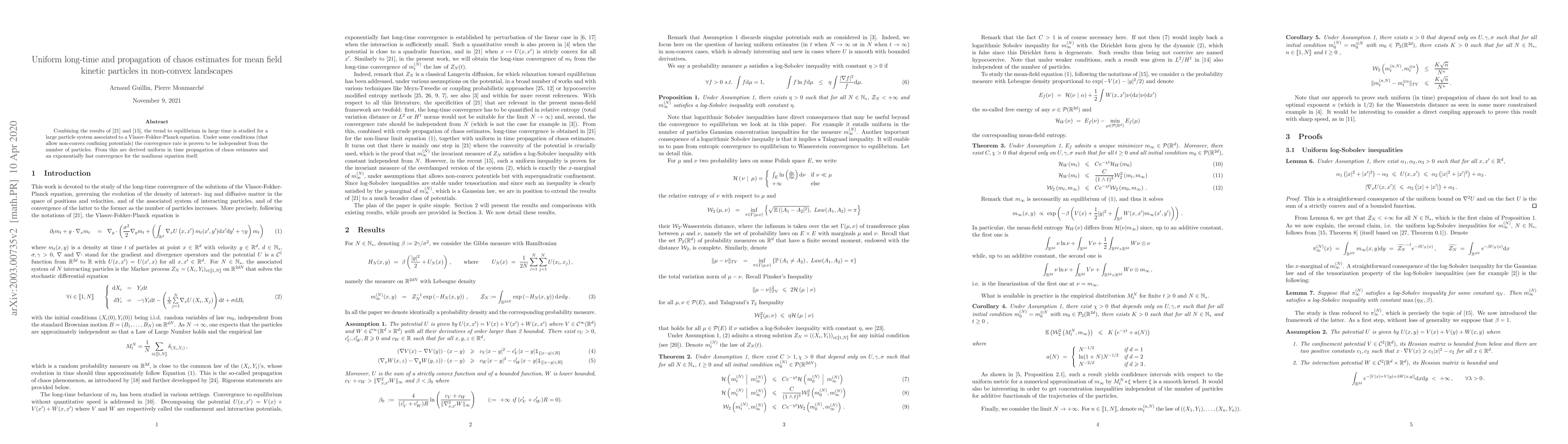 This paper proves uniform long-time convergence rates for a large particle system governed by a Vlasov-Fokker-Planck equation in non-convex landscapes, demonstrating that the convergence rate is independent of the number of particles. It also derives uniform propagation of chaos estimates and exponential convergence for the associated nonlinear equation.