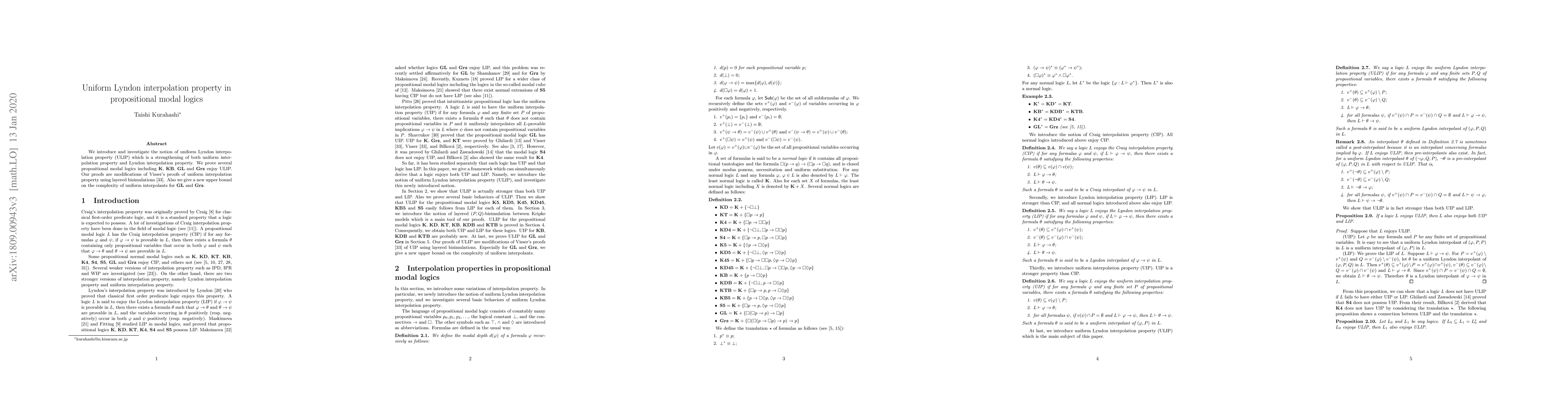 We introduce and investigate the notion of uniform Lyndon interpolation property (ULIP) which is a strengthening of both uniform interpolation property and Lyndon interpolation property. We prove several propositional modal logics including ${\bf K}$, ${\bf KB}$, ${\bf GL}$ and ${\bf Grz}$ enjoy ULIP. Our proofs are modifications of Visser's proofs of uniform interpolation property using layered bisimulations. Also we give a new upper bound on the complexity of uniform interpolants for ${\bf GL}$ and ${\bf Grz}$.