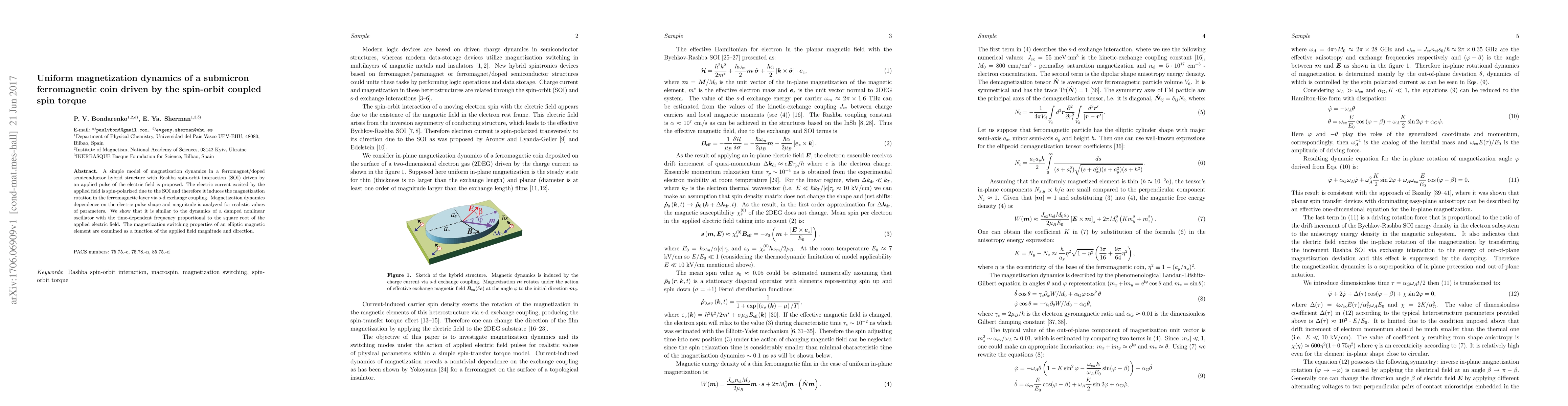 Researchers model magnetization dynamics in a ferromagnetic coin driven by spin-orbit coupled spin torque, finding dynamics similar to a damped nonlinear oscillator with frequency proportional to the applied electric field.