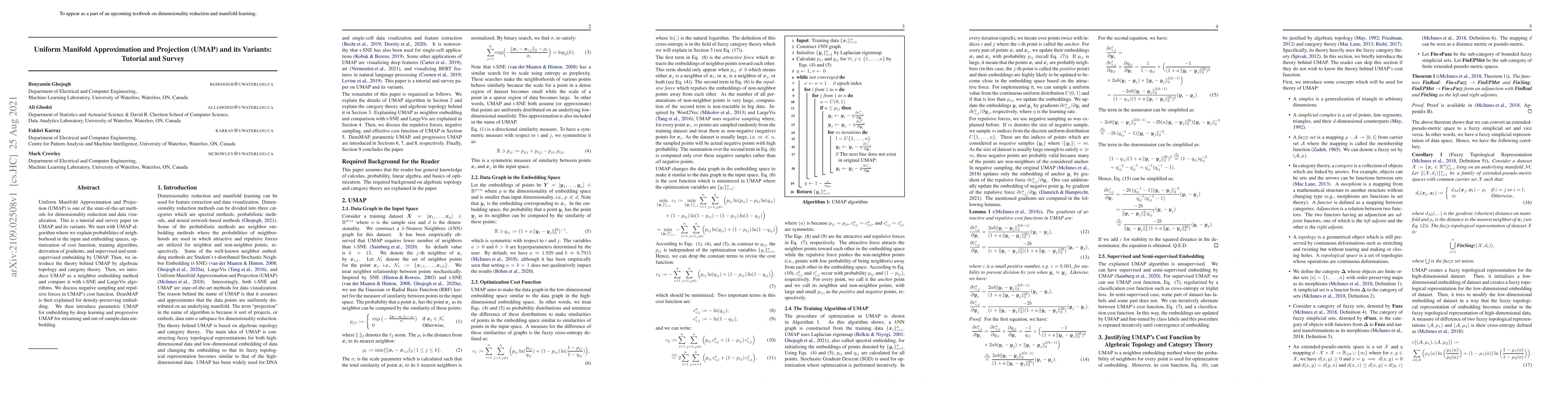 Uniform Manifold Approximation and Projection (UMAP) is one of the state-of-the-art methods for dimensionality reduction and data visualization. This is a tutorial and survey paper on UMAP and its variants. We start with UMAP algorithm where we explain probabilities of neighborhood in the input and embedding spaces, optimization of cost function, training algorithm, derivation of gradients, and supervised and semi-supervised embedding by UMAP. Then, we introduce the theory behind UMAP by algebraic topology and category theory. Then, we introduce UMAP as a neighbor embedding method and compare it with t-SNE and LargeVis algorithms. We discuss negative sampling and repulsive forces in UMAP's cost function. DensMAP is then explained for density-preserving embedding. We then introduce parametric UMAP for embedding by deep learning and progressive UMAP for streaming and out-of-sample data embedding.