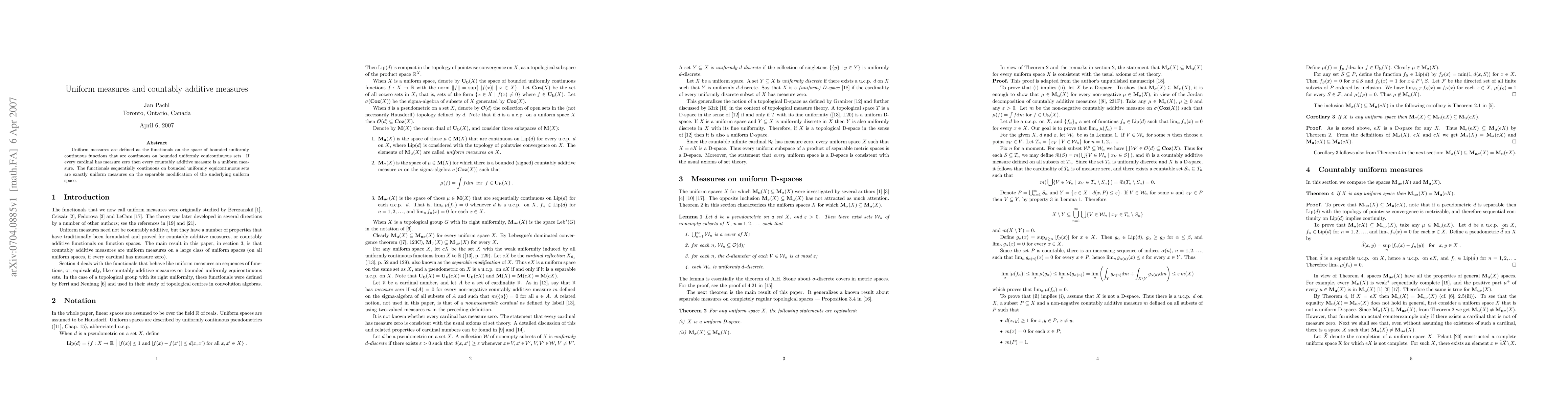 This paper defines uniform measures as functionals on bounded uniformly continuous functions and proves that if every cardinal has measure zero, then every countably additive measure is uniform. It also shows that sequentially continuous functionals on bounded uniformly equicontinuous sets correspond to uniform measures in the separable modification of the uniform space.