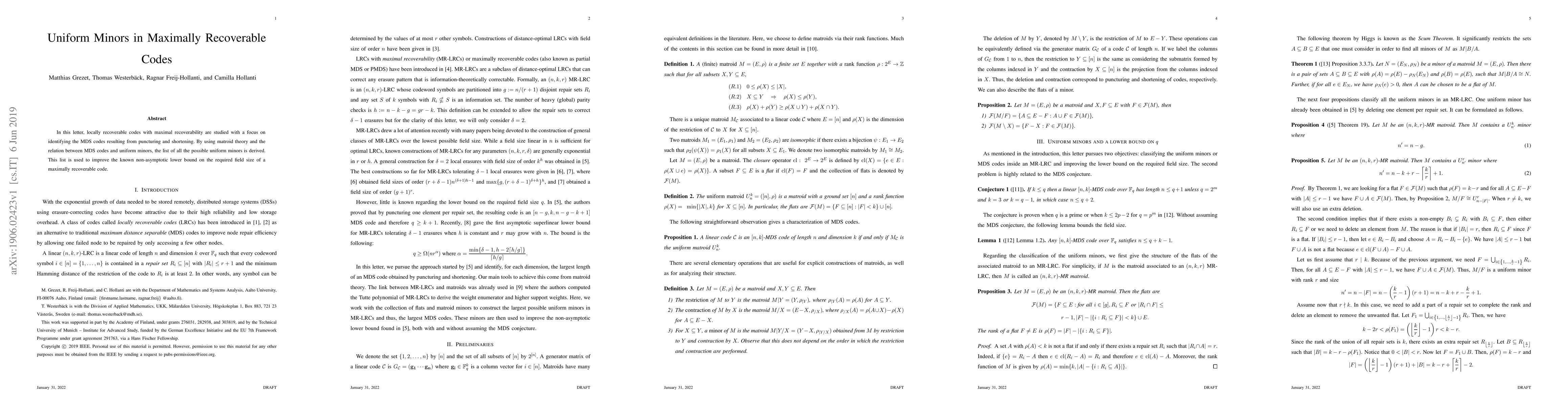 This paper investigates maximally recoverable codes, specifically focusing on MDS codes obtained through puncturing and shortening. It leverages matroid theory to identify all possible uniform minors, thereby enhancing the known non-asymptotic lower bound for the field size needed for such codes.