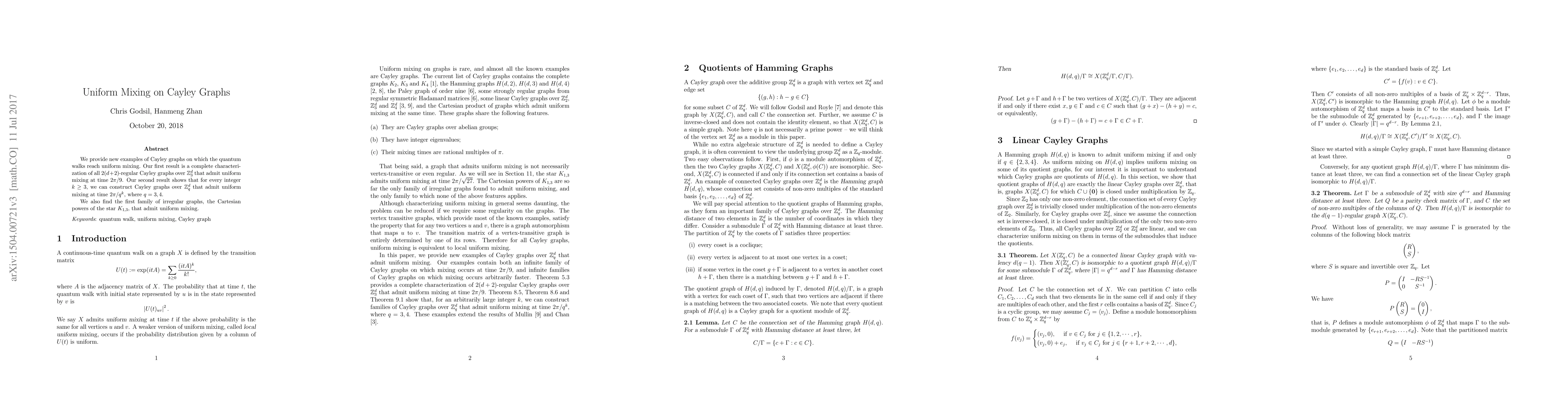 This paper presents new examples of Cayley graphs where quantum walks achieve uniform mixing, specifically characterizing $2(d+2)$-regular Cayley graphs over $\mathbb{Z}_3^d$ and constructing irregular graphs, including Cartesian powers of $K_{1,3}$, that also exhibit uniform mixing.