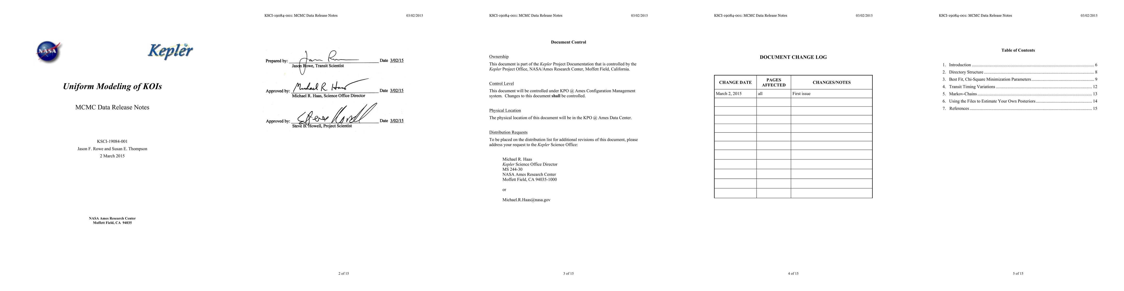 The Kepler Mission used a 0.95-m aperture space-based telescope to continuously observe more than 150 000 stars for 4 years. We model and analyze most KOIs listed at the Exoplanet Archive using the Kepler data. This document describes data products related to the reported planetary parameters and uncertainties for the Kepler Objects of Interest (KOIs) based on a Markov-Chain-Monte- Carlo (MCMC) analysis. Reported parameters, uncertainties and data products can be found at the NASA Exoplanet Archive ( http://exoplanetarchive.ipac.caltech.edu/docs/Kepler_KOI_docs.html ).