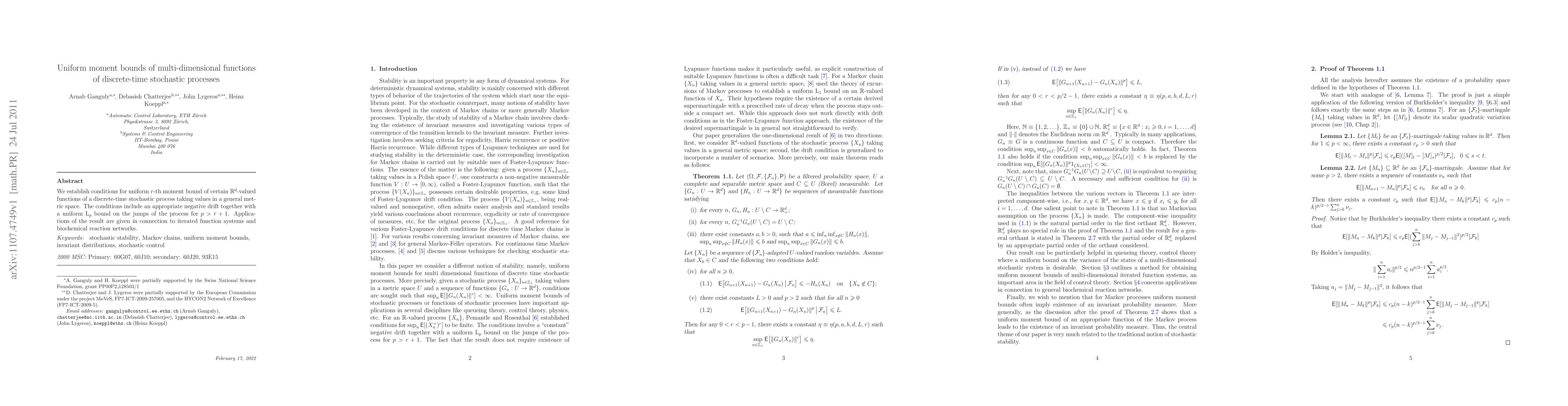 We establish conditions for uniform $r$-th moment bound of certain $\R^d$-valued functions of a discrete-time stochastic process taking values in a general metric space. The conditions include an appropriate negative drift together with a uniform $L_p$ bound on the jumps of the process for $p > r + 1$. Applications of the result are given in connection to iterated function systems and biochemical reaction networks.