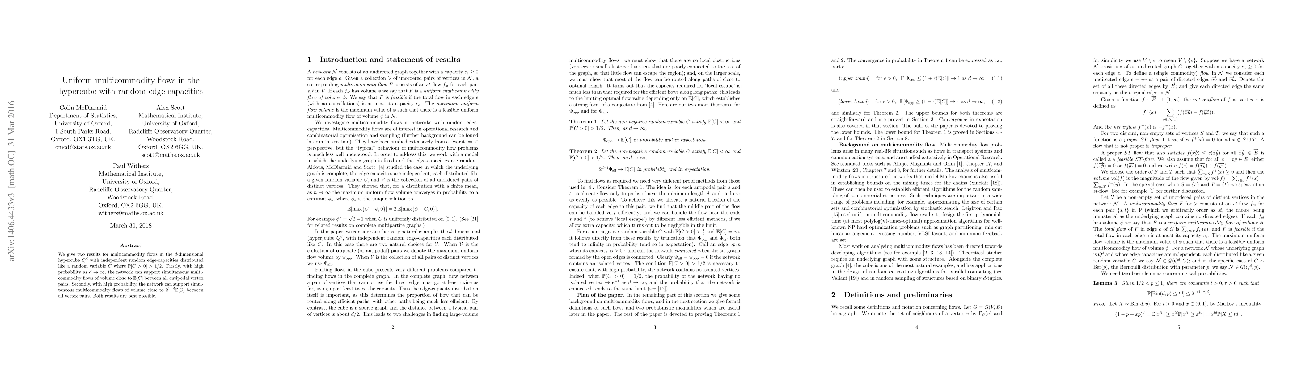 Research shows that a hypercube network with random edge capacities can support large multicommodity flows between vertices, both with volumes close to the capacity and with volumes depending on the dimension.