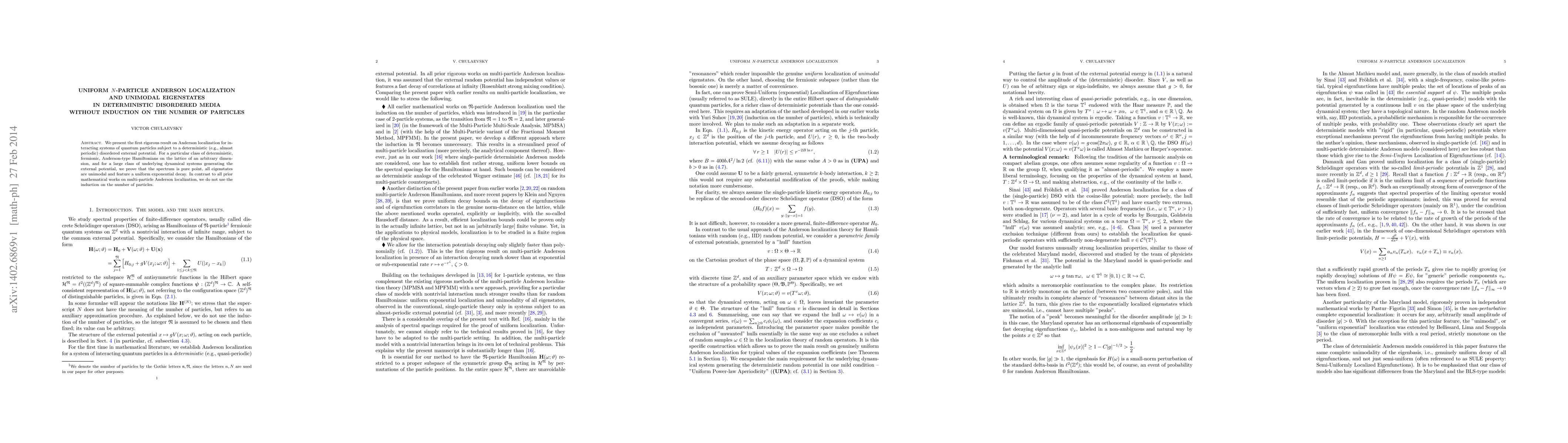 Researchers prove that interacting particles in a deterministic disordered media exhibit pure point spectrum with uniformly decaying eigenstates, without relying on induction on the number of particles.