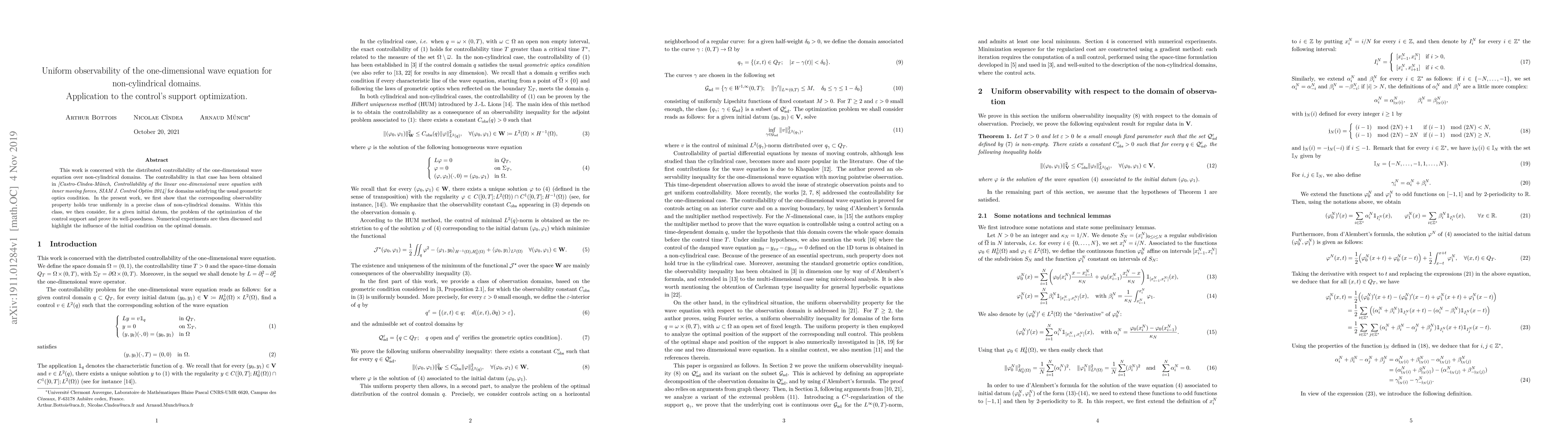 This paper investigates uniform observability of the one-dimensional wave equation in non-cylindrical domains, extending previous results to a broader class of geometries. It also addresses the optimization of control support for achieving distributed controllability, proving the problem's well-posedness and discussing numerical experiments.