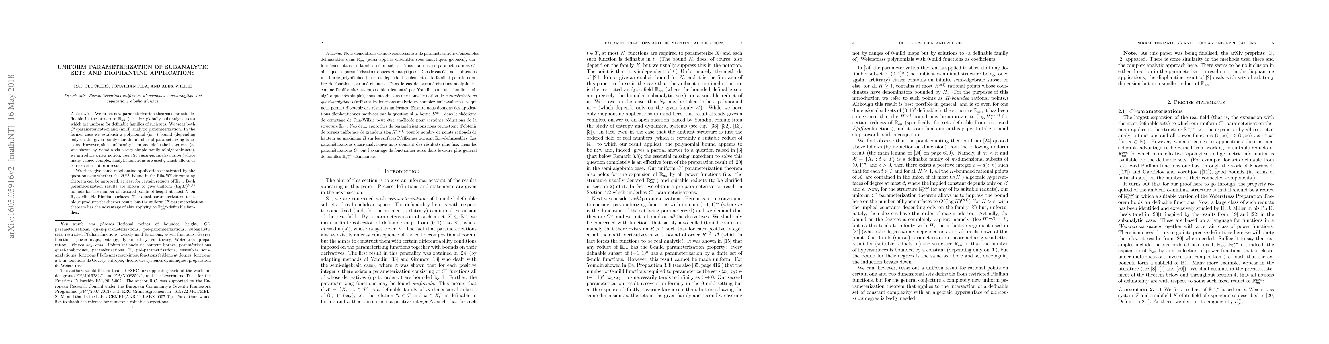 We prove new parameterization theorems for sets definable in the structure $\mathbb{R}_{an}$ (i.e. for globally subanalytic sets) which are uniform for definable families of such sets. We treat both $C^r$-parameterization and (mild) analytic parameterization. In the former case we establish a polynomial (in $r$) bound (depending only on the given family) for the number of parameterizing functions. However, since uniformity is impossible in the latter case (as was shown by Yomdin via a very simple family of algebraic sets), we introduce a new notion, analytic quasi-parameterization (where many-valued complex analytic functions are used), which allows us to recover a uniform result. We then give some diophantine applications motivated by the question as to whether the $H^{o(1)}$ bound in the Pila-Wilkie counting theorem can be improved, at least for certain reducts of $\mathbb{R}_{an}$. Both parameterization results are shown to give uniform $(\log H)^{O(1)}$ bounds for the number of rational points of height at most $H$ on $\mathbb{R}_{an}$-definable Pfaffian surfaces. The quasi-parameterization technique produces the sharper result, but the uniform $C^r$-parametrization theorem has the advantage of also applying to $\mathbb{R}_{an}^{pow}$-definable families.