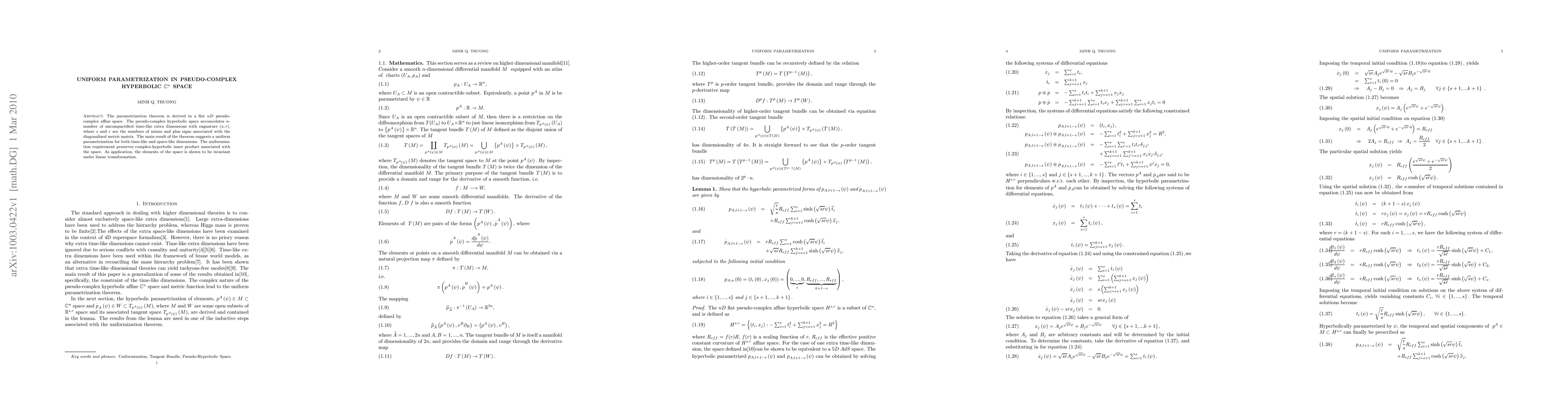 The parametrization theorem is derived in a flat nD pseudo-complex affine space. The pseudo-complex hyperbolic space accomodates n-number of uncompactified time-like extra dimensions with sugnature (s,r), where s and r are the numbers of minus and plus signs associated with the diagonalized metric matrix. The main result of the theorem suggests a uniform parametrization for both time-like and space-like dimensions. The uniformization requirement preserves complex-hyperbolic inner product associated with the space. As application, the elements of the space is shown to be invariant under linear transformation.