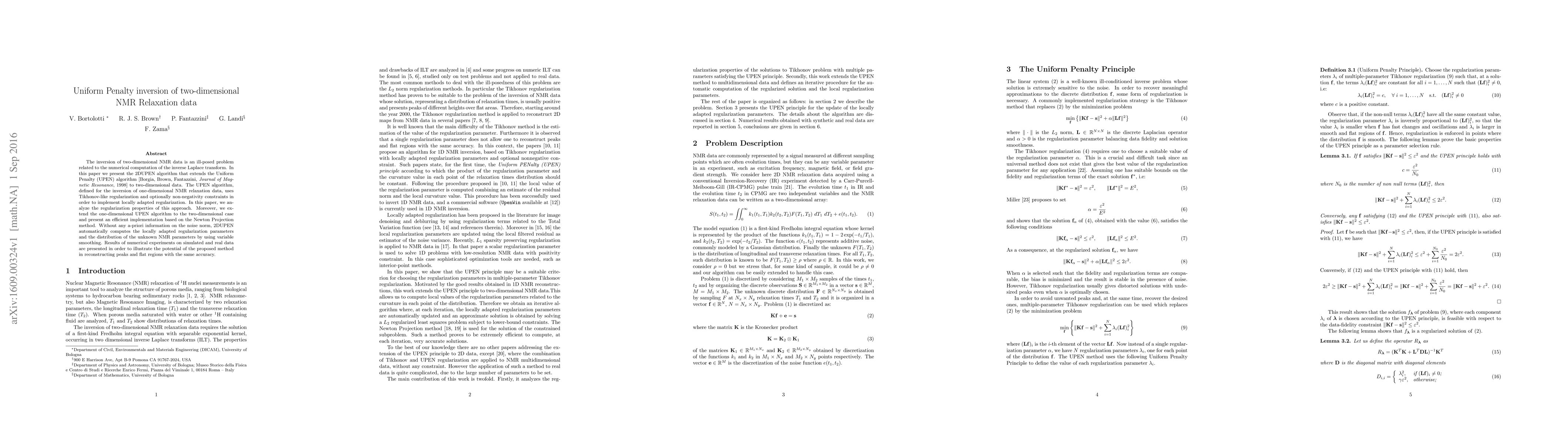 This paper introduces the 2DUPEN algorithm for inverting two-dimensional NMR relaxation data, extending the Uniform Penalty (UPEN) method to handle the ill-posed nature of the problem. The method employs Tikhonov-like regularization and variable smoothing to compute locally adapted regularization parameters without prior noise norm information.