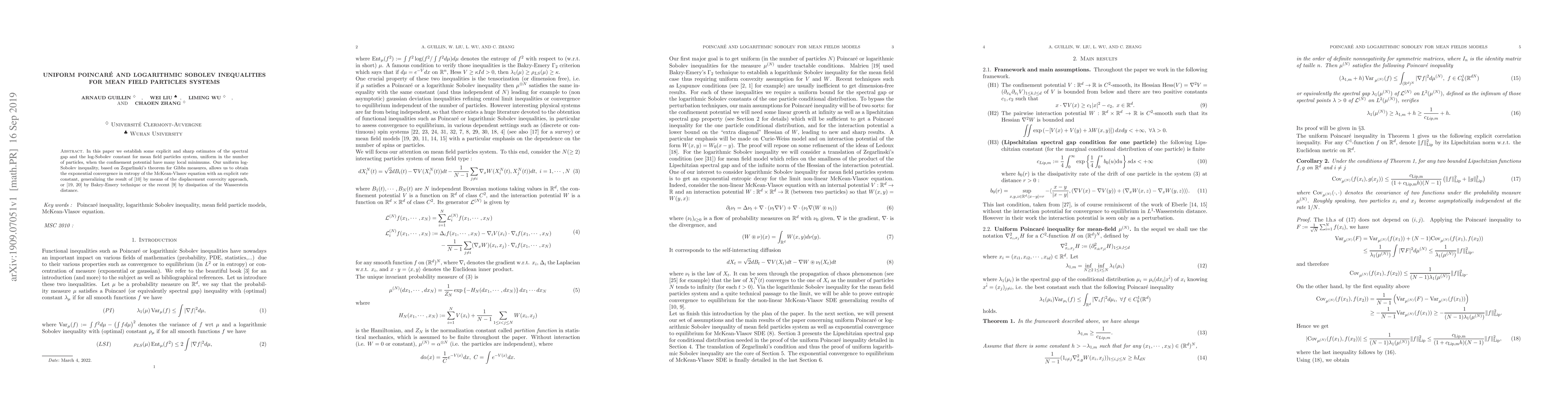 In this paper we establish some explicit and sharp estimates of the spectral gap and the log-Sobolev constant for mean field particles system, uniform in the number of particles, when the confinement potential have many local minimums. Our uniform log-Sobolev inequality, based on Zegarlinski's theorem for Gibbs measures, allows us to obtain the exponential convergence in entropy of the McKean-Vlasov equation with an explicit rate constant, generalizing the result of [10] by means of the displacement convexity approach, or [19, 20] by Bakry-Emery technique or the recent [9] by dissipation of the Wasserstein distance.