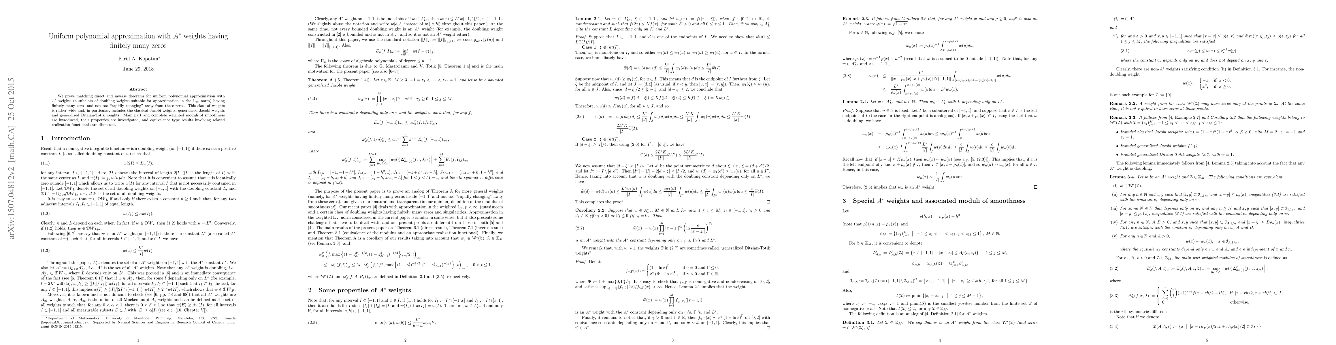 This paper establishes matching direct and inverse theorems for uniform polynomial approximation using $A^*$ weights with finitely many zeros. It explores the properties of main part and complete weighted moduli of smoothness, and discusses equivalence results involving related realization functionals.