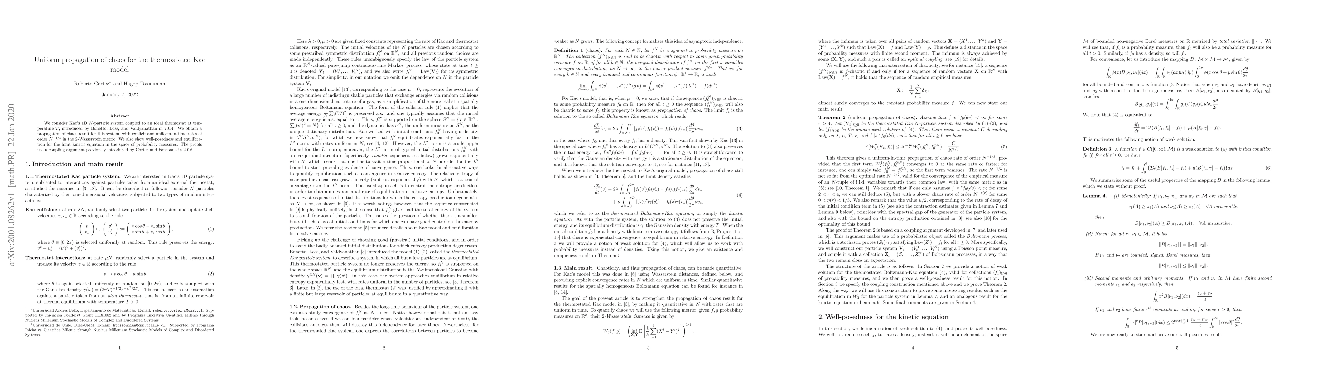 We consider Kac's 1D N-particle system coupled to an ideal thermostat at temperature T, introduced by Bonetto, Loss, and Vaidyanathan in 2014. We obtain a propagation of chaos result for this system, with explicit and uniform-in-time rates of order N^(-1/3) in the 2-Wasserstein metric. We also show well-posedness and equilibration for the limit kinetic equation in the space of probability measures. The proofs use a coupling argument previously introduced by Cortez and Fontbona in 2016.