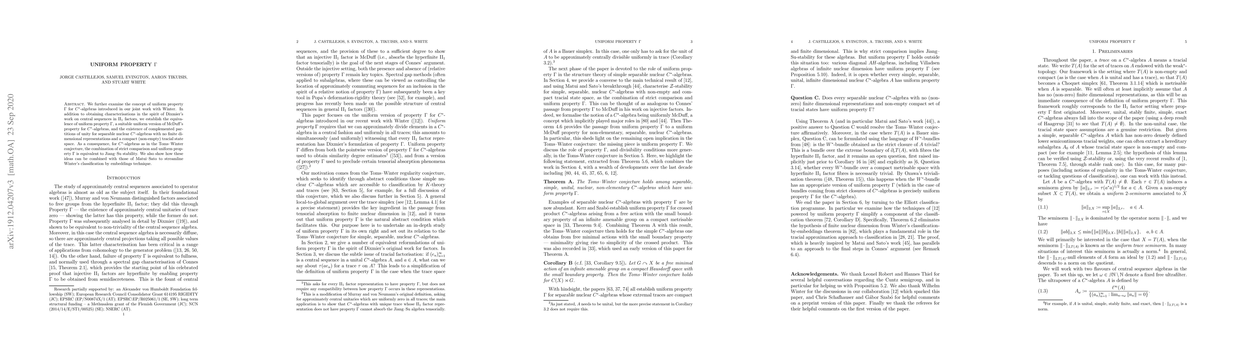 We further examine the concept of uniform property Gamma for C*-algebras introduced in our joint work with Winter. In addition to obtaining characterisations in the spirit of Dixmier's work on central sequence in II$_1$ factors, we establish the equivalence of uniform property Gamma, a suitable uniform version of McDuff's property for C*-algebras, and the existence of complemented partitions of unity for separable nuclear C*-algebras with no finite dimensional representations and a compact (non-empty) tracial state space. As a consequence, for C*-algebras as in the Toms-Winter conjecture, the combination of strict comparison and uniform property Gamma is equivalent to Jiang-Su stability. We also show how these ideas can be combined with those of Matui-Sato to streamline Winter's classification-by-embeddings technique.